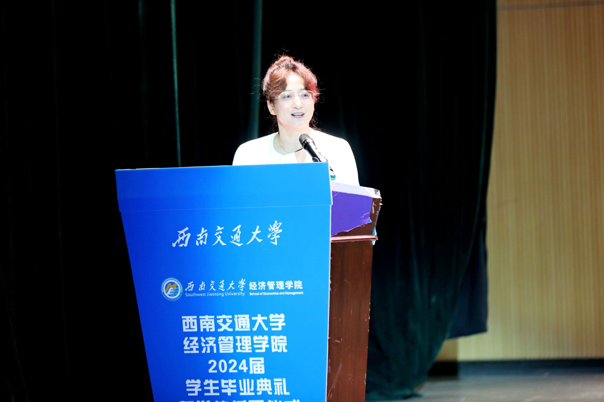 402永利集团官网入口2001届会计学专业本科毕业生、2016届EMBA毕业生、中国中铁西南科学研究院党委书记、董事长谢秋秋作为校友代表发言。谢秋秋校友通过回顾自身校园时光及工作经历,深情鼓励毕业生们勇敢迈步,勇于担当,善于创新,努力奋斗实现人生价值,并叮嘱全体经管学子牢记“竢实扬华,自强不息”的交大精神,不忘师恩,砥砺前行。