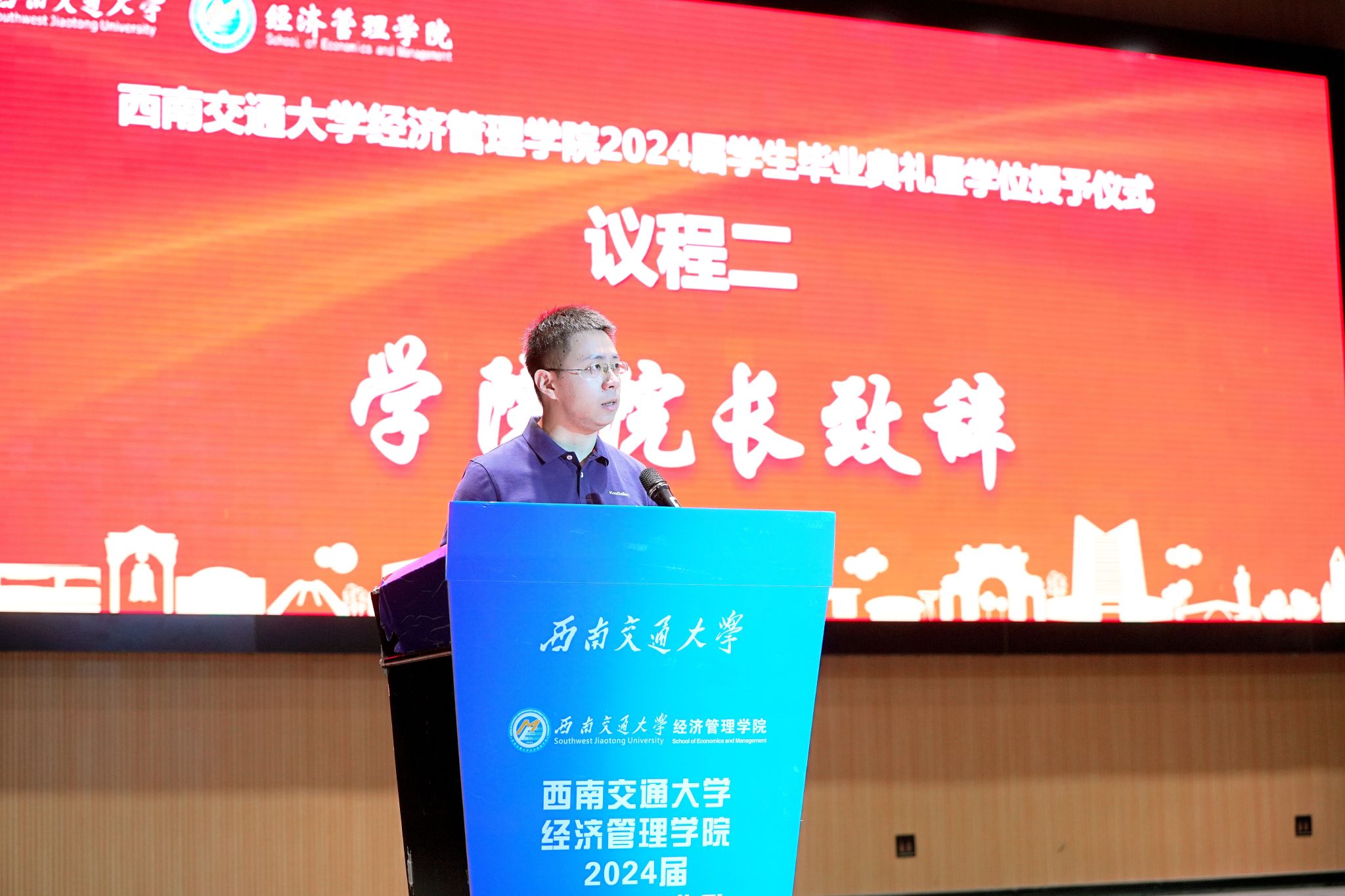 首先,学院院长韩科为典礼致辞。他代表402永利集团官网入口全体师生,向全院2024届毕业生表示热烈祝贺,并对他们在学院学习期间所取得的成绩给予高度认可。临别之际,他强调,希望同学们时刻谨记校训、院训,发扬交大精神,展现交大学子的担当。同时,韩院长为毕业生们提出了三点建议:一是提升境界的高度,二是拓展胸怀的广度,三是加深信念的深度,希望毕业生们带着学院的关心关怀,无惧风雨,奋勇前进,学院永远是经管学子们温馨的家。字字句句间,都寄托着对全体毕业生的深情嘱托与美好祝愿。