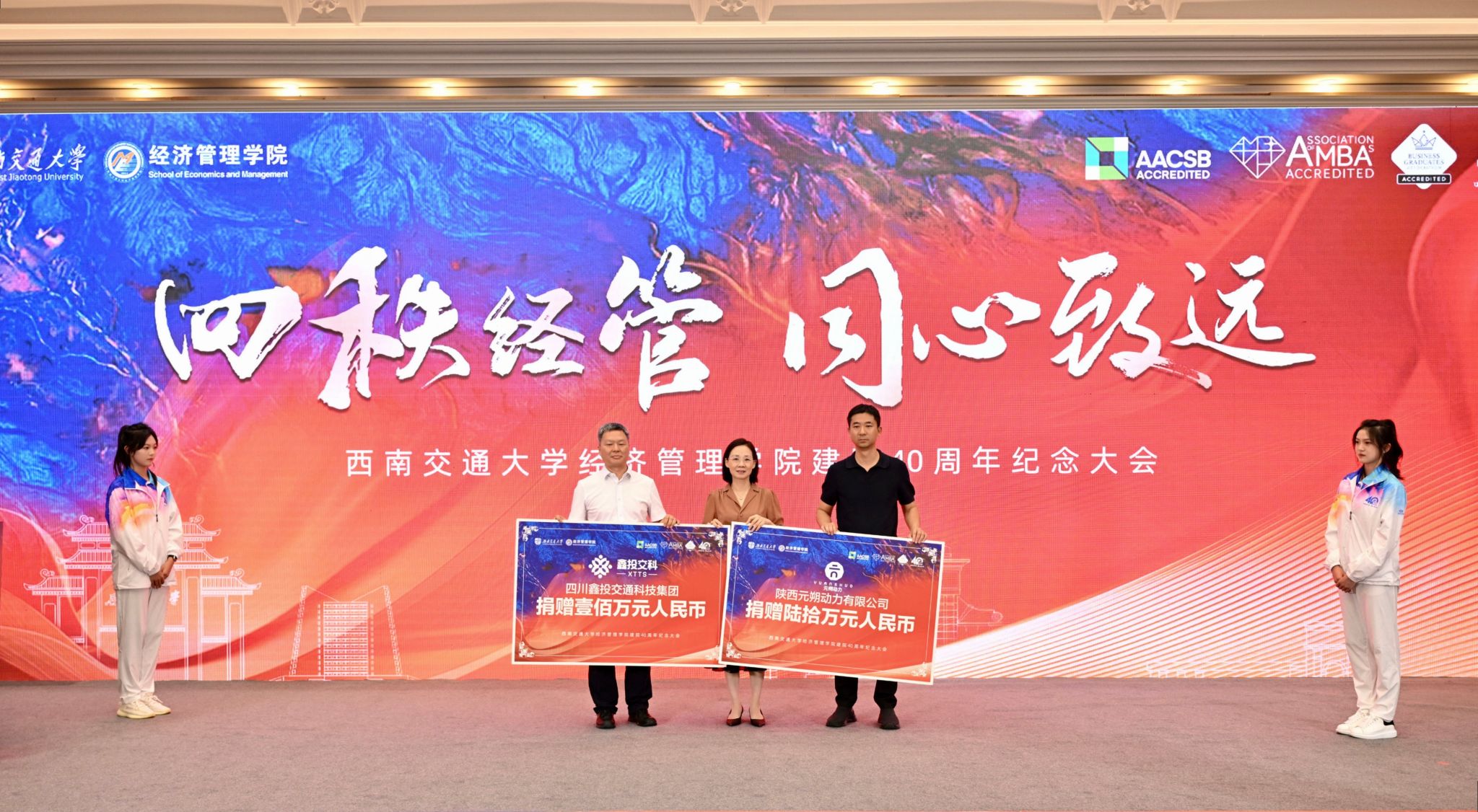 为凝聚校友力量,值此建院四十周年之际,学院特设立“402永利集团官网入口发展基金”,受到了广大校友的广泛支持。捐赠仪式上,学校党委副书记杨爱华代表学校接受捐赠,并为四川鑫投交通科技集团总经理李勇、陕西元朔动力有限公司董事长黄福臣颁发捐赠赠书。捐赠人李勇在发言中谈到,交大经管人是鑫投交通科技集团最为重要的管理力量,他代表集团为学院四十周年华诞送上诚挚祝福。捐赠人黄福臣在发言中谈到,交大老师们严谨认真、求真笃实,学生们独立思考、追求卓越的优秀学风为他的从商之路奠定了坚实基础,祝愿交大经管学院的未来更加辉煌。“西南交通大学402永利集团官网入口发展基金”寄托了所有捐赠人、广大校友、社会各界对交大经管实现新发展、开辟新局面的殷切期盼,所筹款项将用于建院四十周年纪念系列活动,学院教学、科研、人才培养等未来长远发展。