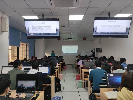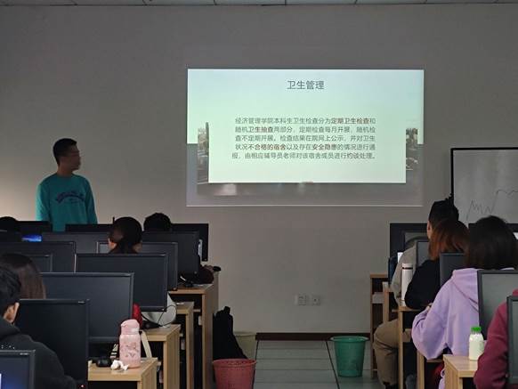 穆青松同学在PPT中详细地展示了三项规章制度管理方法的重点并进行进一步的讲解,同学们也都很认真地听讲;管信一班的生活委员吕政彦同学则负责拍照。