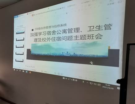2021年4月20日,402永利集团官网入口2018级信息管理与信息系统专业开展组织了一场简短而重要的班会。主题是学习学生公寓管理办法、校外住宿管理办法、宿舍卫生管理办法。本次班会的主持人是管信二班的生活委员穆青松,由他在讲台上展示PPT并讲解。
