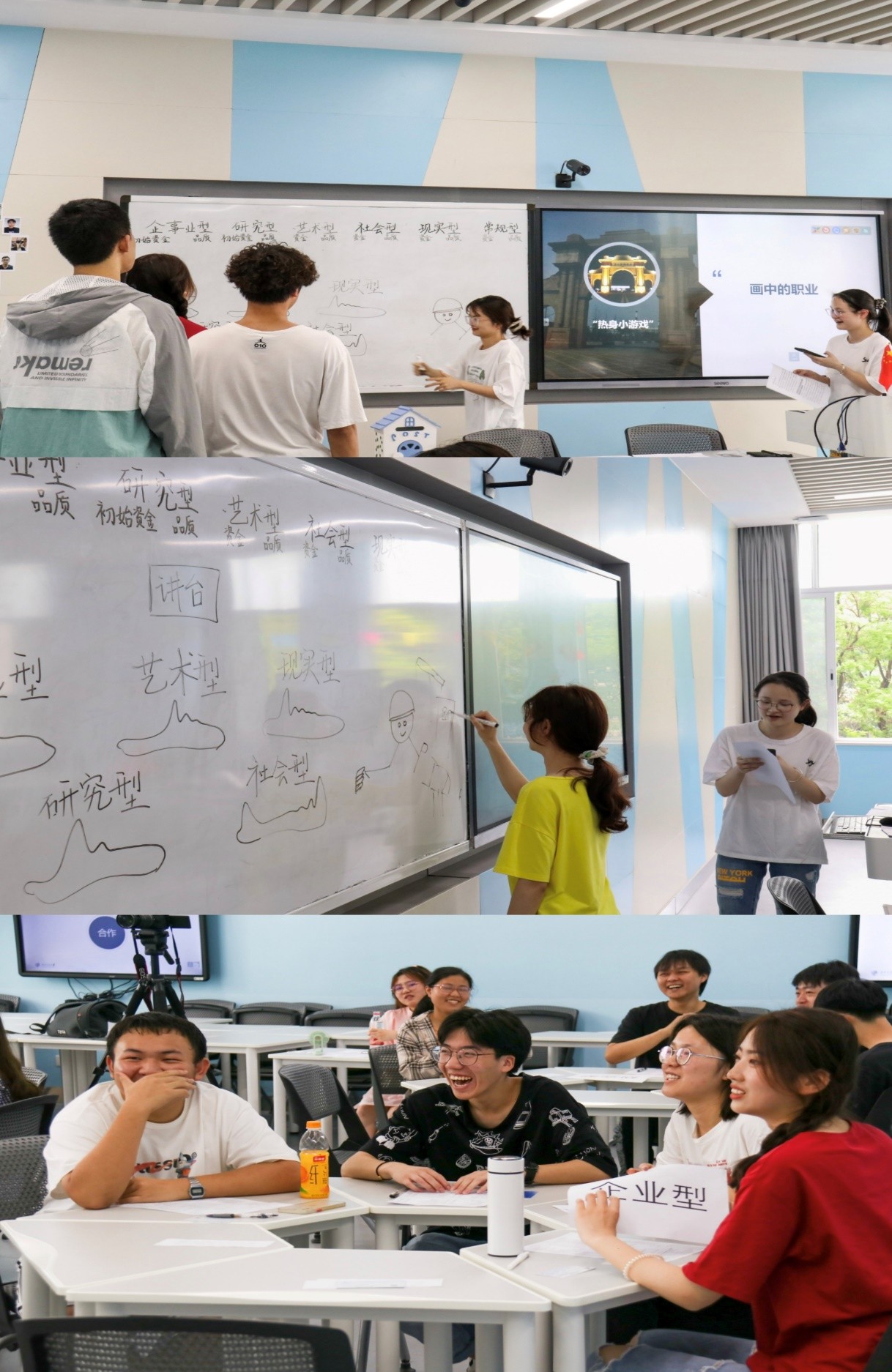 紧接着,班长邀请了莫代玉和同学们同玩热身小游戏。大家限时接力用画画的方式描绘主持人给出的职业。通过这个小游戏同学们看到了大家对于同一职业的不同理解,既活跃了现场气氛,也很好地呼应了生涯规划的主题。