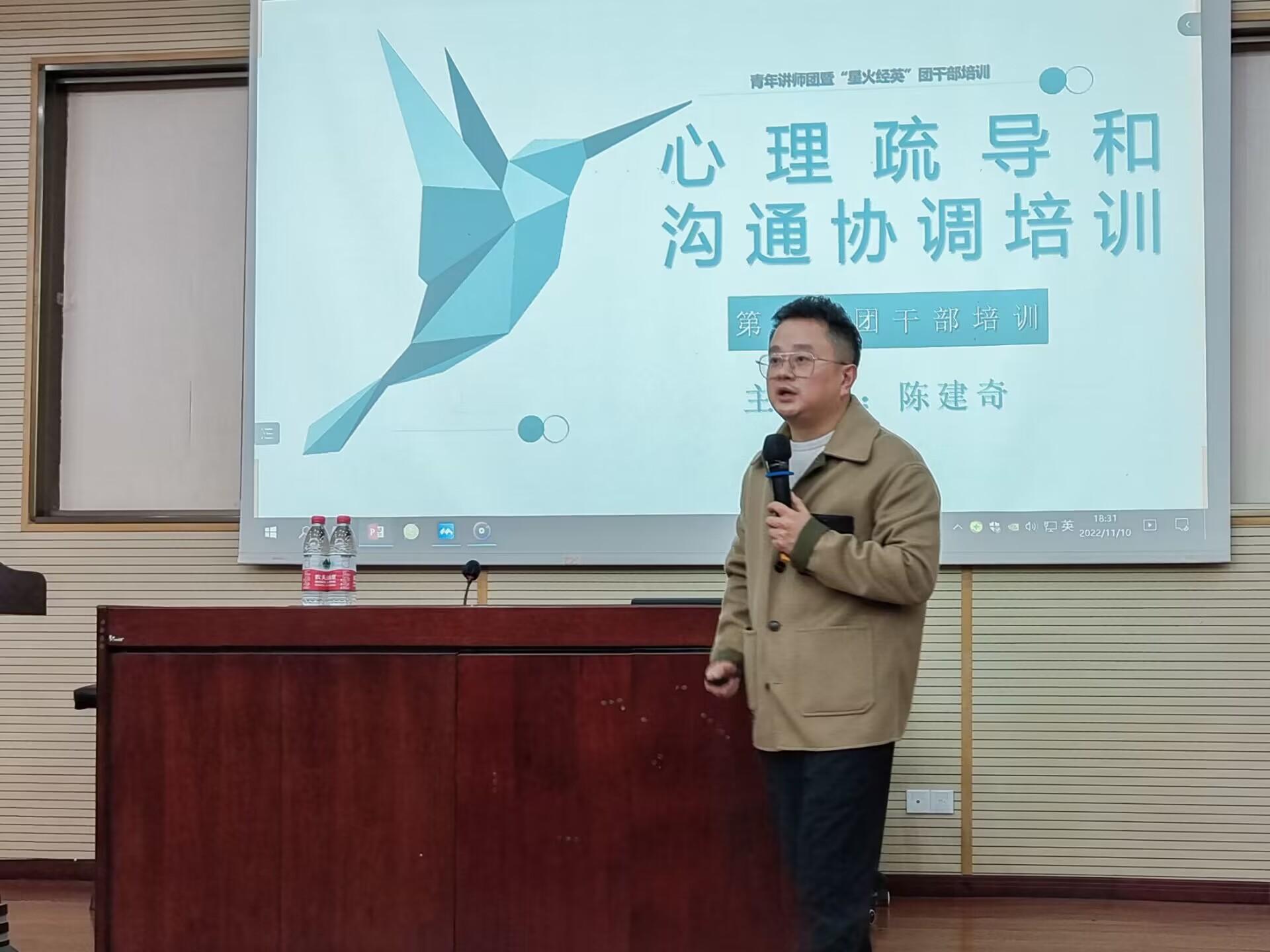 2022年11月10日晚,402永利集团官网入口于J0202教室开展了“星火经英”计划第十期第八次团干部培训,本次培训由分团委副书记、402永利集团官网入口本科2020级辅导员、青年志愿者协会指导老师陈建奇主讲,培训主题为“心理疏导和沟通协调培训”,旨在让团干部们了解心理疏导,明白进行大学生心理疏导以及沟通的重要性以及如何开展。