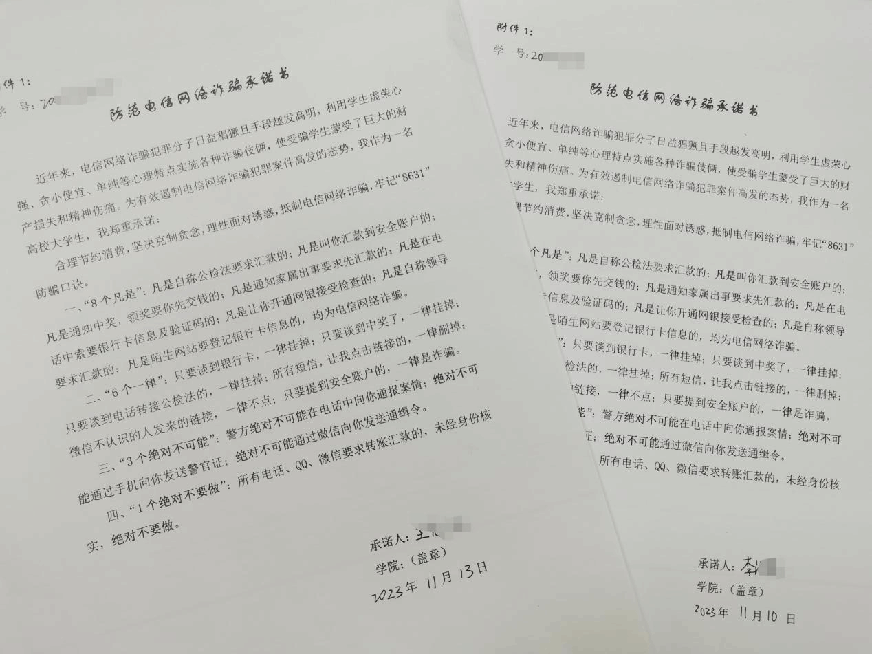 以学校保卫处及金牛区派出所做的防诈骗教育专题讲座为基础,402永利集团官网入口本科2023级通过主题班会、年级大会等开展防范电信网络诈骗教育,组织新生学习反诈知识,组织新生签署防范电信网络诈骗承诺书和《拒绝买卖、转借、转租手机卡、银行卡等涉嫌违法犯罪承诺书》,提高同学们防骗意识和防骗能力。