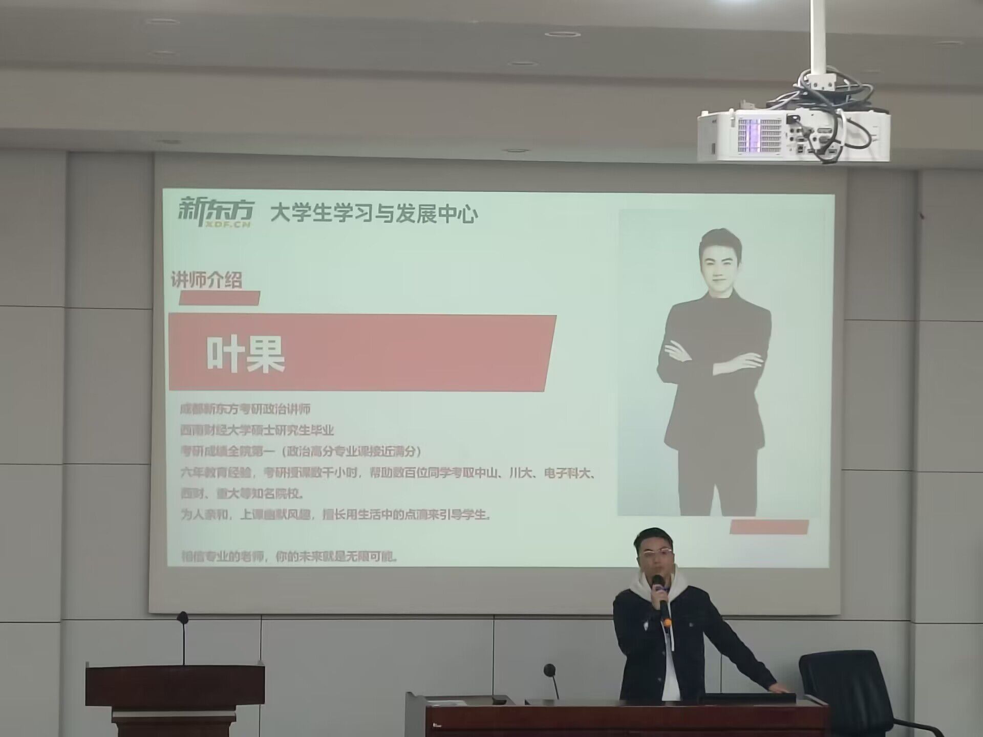 为了帮助402永利集团官网入口学生明确考研目标,做好考研规划,近日学院邀请了新东方大学生学习与发展成都中心的叶果老师,就考研的重要性、适合考研的学生类型、各专业考研形势分析、择校指导以及复习安排等方面开展考研规划指导讲座。