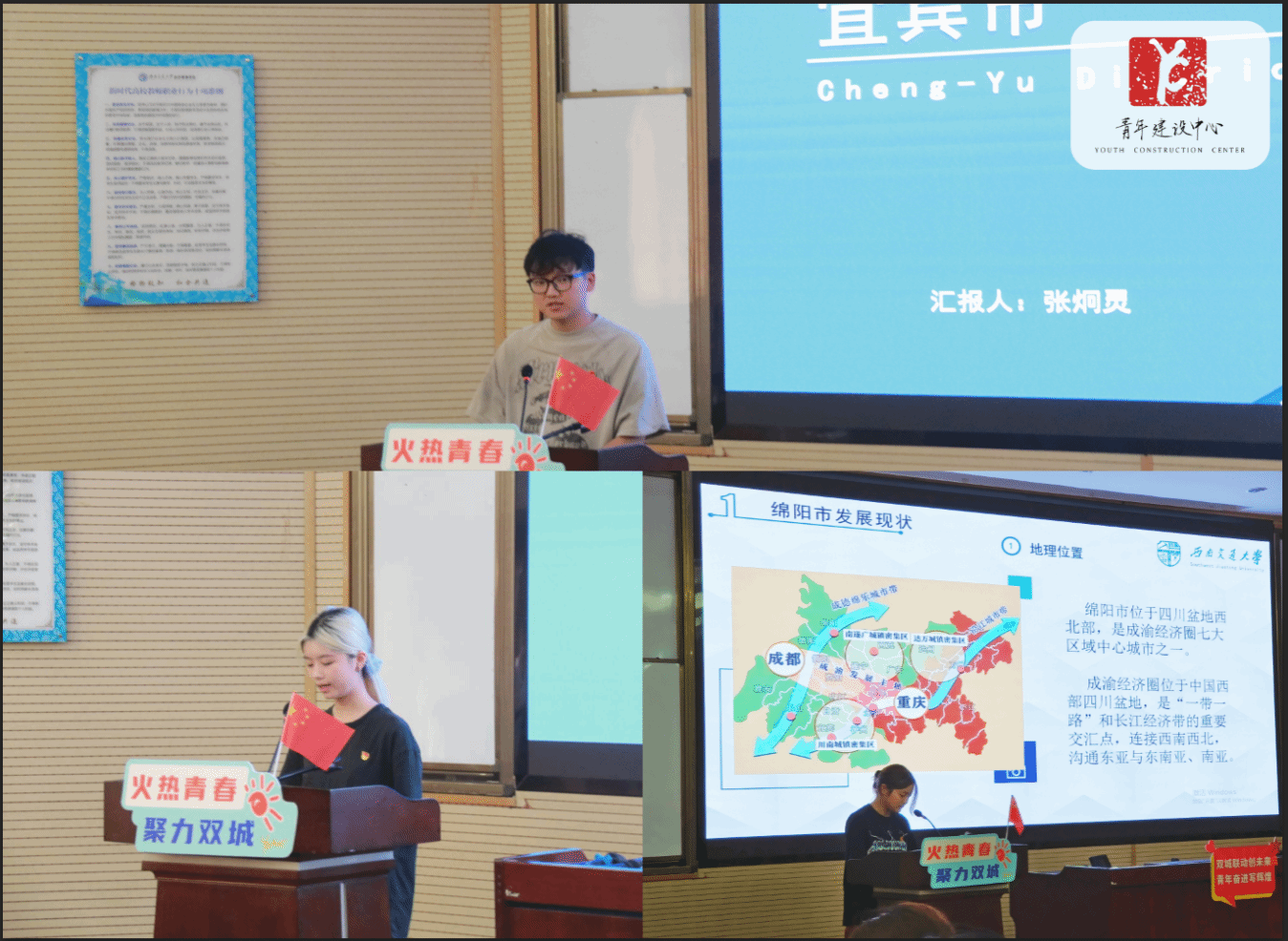 第一项议程,主持人先指明活动主题——“唱响成渝‘双城记’,青春有为建新功”,并从历史同脉、经济同体、地理同域、文化同源、使命共担、命运共通六个方面宣讲成渝双城的紧密关系,指出本次活动旨在将实践内容与专业知识紧密结合、高度耦合,培养团员青年的社会责任感和时代使命感。