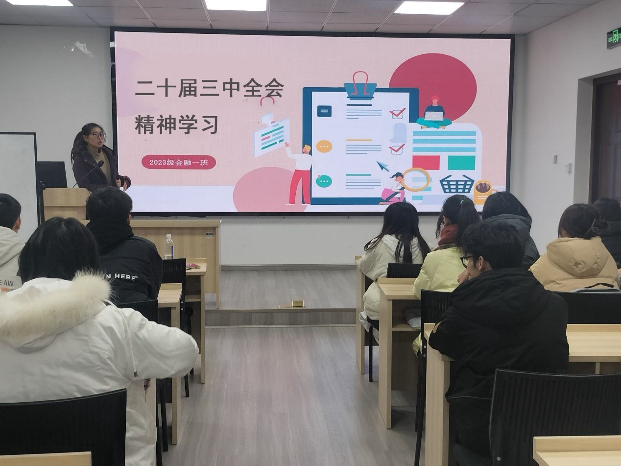 2024 年 12 月 11 日晚,402永利集团官网入口金融 2023-01 班成功开展了一次主题为“学习党的二十届三中全会精神”的团课活动。学院团委书记贾佳老师带领同学们学习了党的二十届三中全会精神,同学们围绕推动金融高水平对外开放、成渝双城经济圈金融中心建设等方面进行了深入学习和讨论。