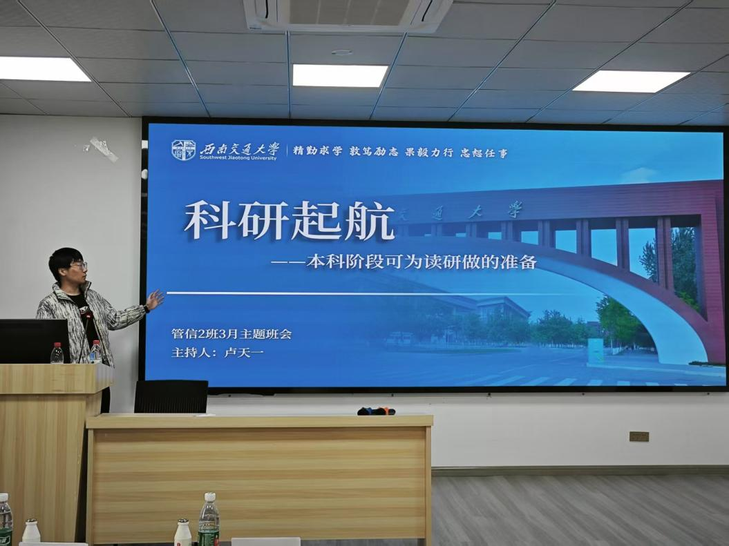 2025年3月13日晚,402永利集团官网入口本科2023级管信2班“科研起步”主题班会在J0819正式开展。参加本次班级见面会的嘉宾有班导师杨斐老师和2022级会计学专业柯梦清学姐。本次主题班会分为以下4个板块:班级建设概况、守护安全与健康、科研起步知识分享、总结与展望。本次班会由班长卢天一主持。