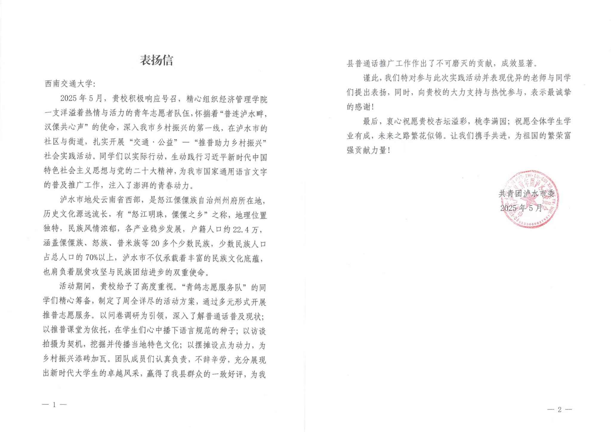 此次实践活动,队员们怀揣热忱,深入基层,致力于国家通用语言文字推广,为语言文字普及教育添砖加瓦,同时也为乡村振兴注入了青春的活力。活动得到了当地政府、群众的高度评价和积极支持。活动结束后,实践团队收到了来自共青团泸水市委的表扬信。普连泸水畔,汉僳共心声,让我们共乘推普之舟,扬起文化自信的风帆,在铸牢中华民族共同体意识、助力乡村振兴的道路上乘风破浪、奋勇远航!