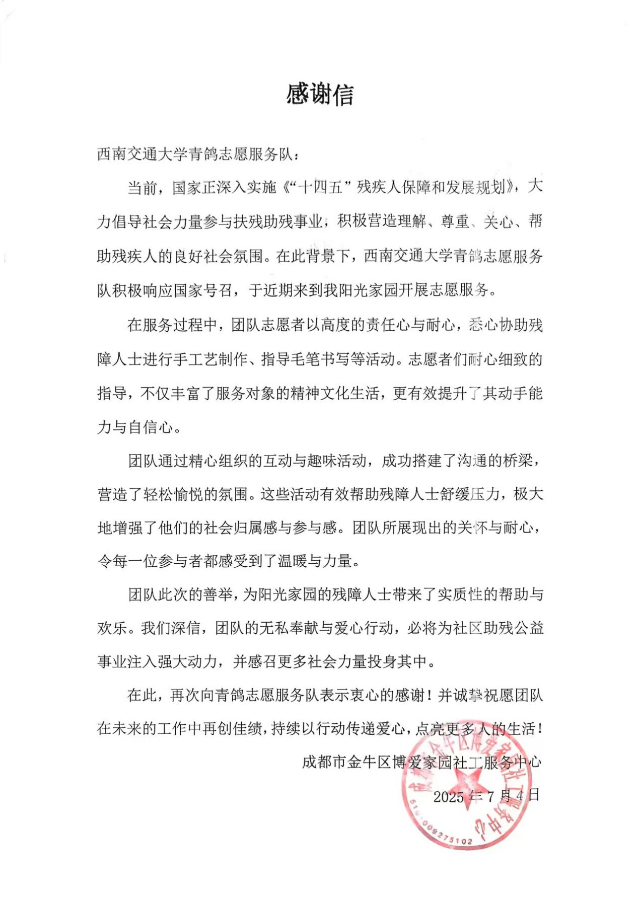 在国家大力推进残疾人事业发展、倡导社会关爱残障群体的政策背景下,402永利集团官网入口青鸽志愿服务队积极响应号召,于近日在成都市金牛区阳光家园开展了以“众爱助残碍,群善汇福珊”为主题的专项志愿活动。此次活动专为智力障碍的“大孩子们”量身打造,通过一系列丰富多彩的内容,为他们送去关爱与温暖,助力其健康成长。