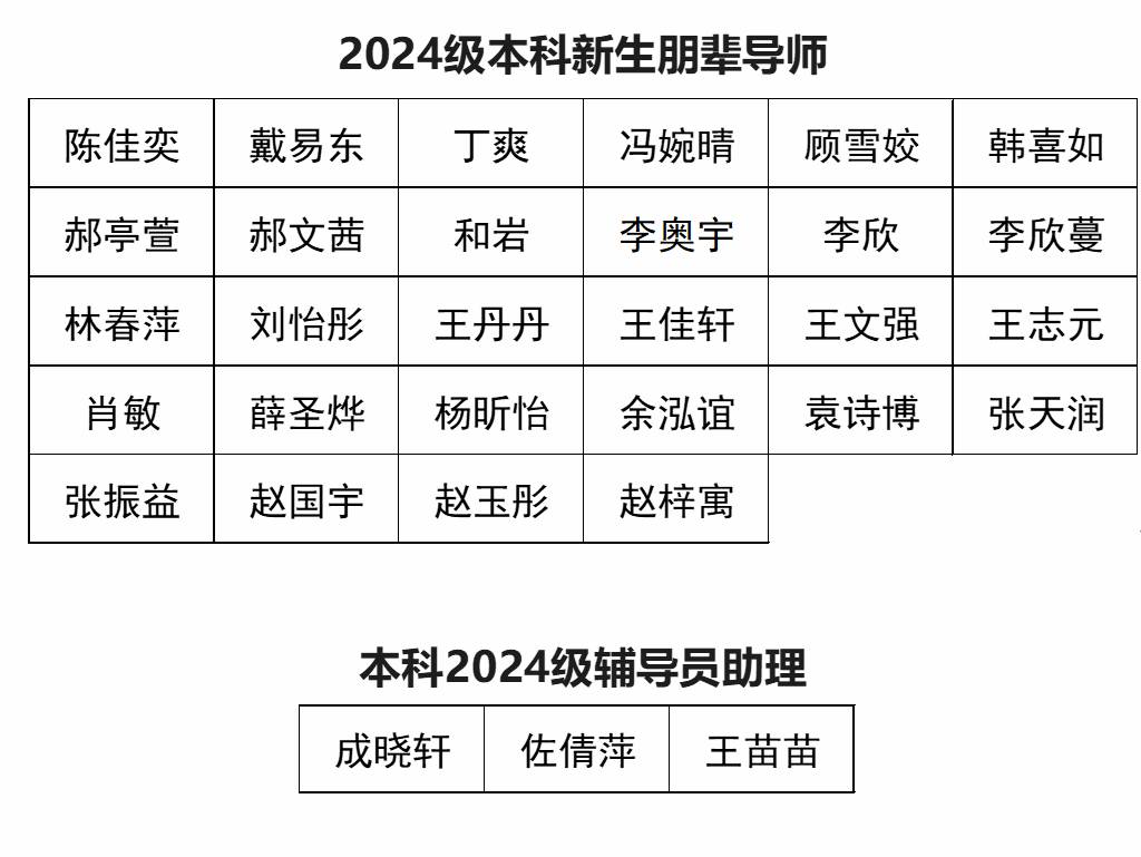 为了更好地开展永利集团官网2024级本科新生入学教育、管理和服务工作,402永利集团官网入口学生工作组于近期开展了2024级本科新生朋辈导师(每班配备新生朋辈导师2名)及辅导员助理选聘工作,经过学生申请、申请表筛选、面试考察等环节,最终选聘结果如下: