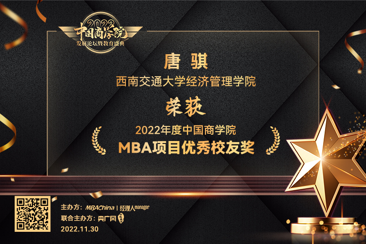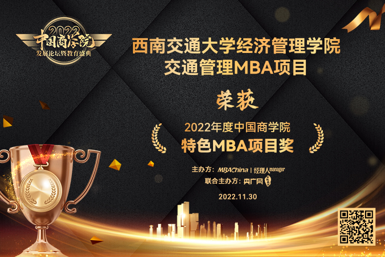 402永利集团官网入口MBA项目凭借优异的教学成果、独特的培养模式,经过多环节、多维度的层层评选,一举荣获多个荣誉奖项:402永利集团官网入口MBA项目成功入榜“2022年度中国商学院最佳MBA项目TOP100”;402永利集团官网入口交通管理MBA项目荣获“2022年度中国商学院特色MBA项目奖”;宾勇刚、唐骐两位校友荣获“2022年度中国商学院MBA项目优秀校友奖”。