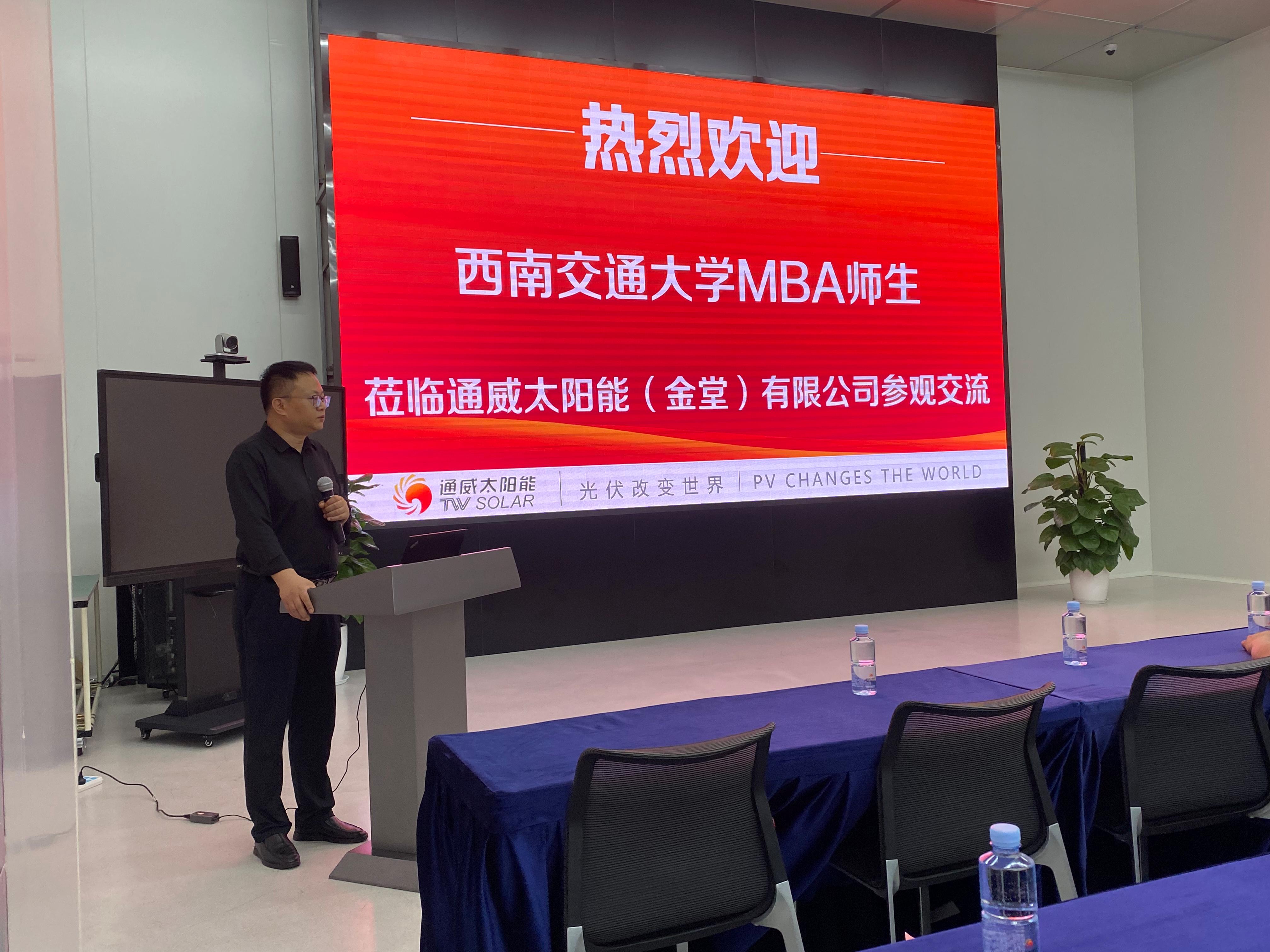 在通威太阳能(金堂)有限公司相关领导同事的热情接待下,师生一行对通威集团的发展历程、新能源产业的发展布局、智能制造的建设成果以及产学研相结合的生产管理方法等进行了深入切实的现场学习。