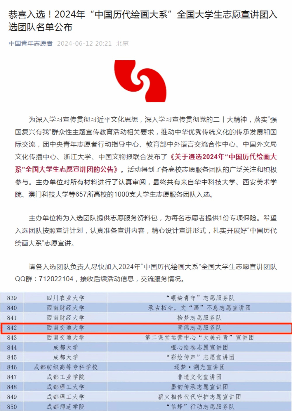学院团委积极响应号召,积极组织学生志愿服务队报名参与遴选。近日,大学生志愿服务团队入选名单已公布,永利集团官网“青鸽志愿服务队”从全国千余所高校的几千支队伍中脱颖而出,同时入选“2024年中国历代绘画大系”志愿宣讲团和2024年关爱行动“七彩假期”志愿服务团。