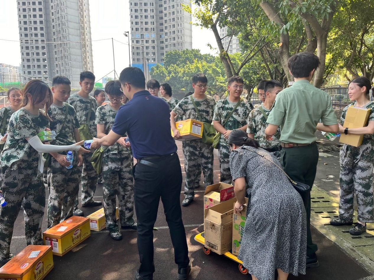 接着,学院领导为同学们送上了精心准备的慰问品。他们将小面包、士力架、冰凉贴、能量饮料等物资递给学生,叮嘱学生们要注意防暑降温,及时补充水分,保持身体健康。此外,学院还为军训学生准备了藿香正气水、花露水等保障物资。同学们纷纷表示,学院的关怀让他们倍感温暖,他们将把这份关怀转化为动力,更加努力的完成军训任务,展现经管学子的风采。