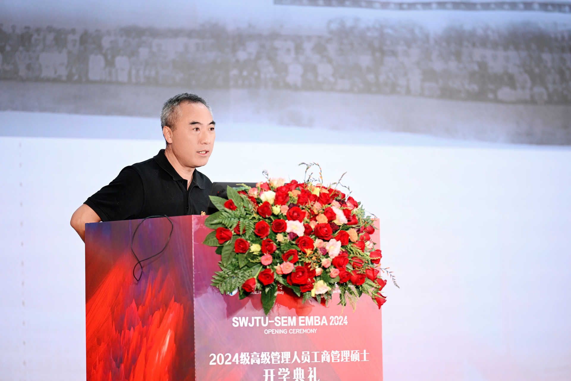 紧接着,杜敏通先生作为EMBA新生代表发言。他代表全体新生向学校和老师表示敬意和感谢,向同学表示祝福和期待。他希望同学们积极学习,不懈努力,争做杰出的企业家和管理者。通过在西南交大的学习,为社会的进步和国家的发展贡献自己的力量。