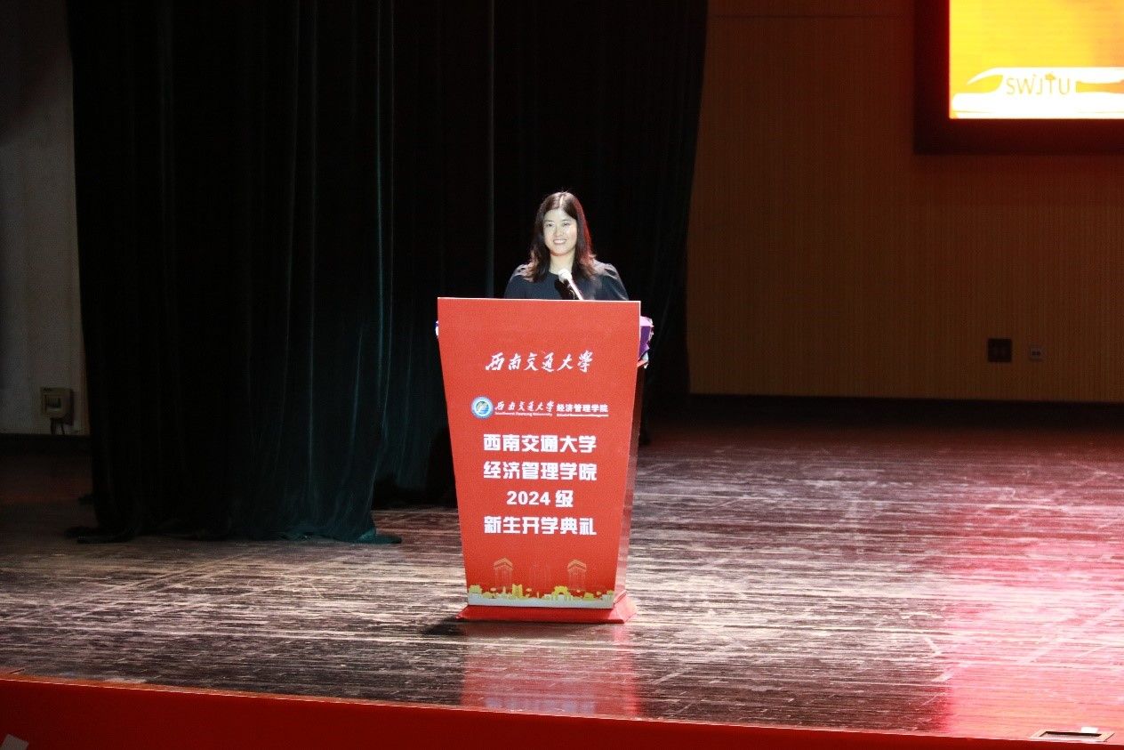 议程六,MBA新生代表曾歆媛发言。阔别校园数年,曾歆媛有着不一样的体会。谈起工作经历,她表示虽有丰富的工作和管理经验,却容易陷入工作思维和方法固化的囹圄,所以她深感持续学习的重要性。她认为,402永利集团官网入口作为四川省唯一同时获得AMBA、BGA、AACSB三大国际认证的学院,是培养综合技能、拓宽个人认知边界的理想选择。今日的求学身份,仿佛更加珍贵,对于未来学习生涯,她强调需要主动走出舒适圈,主动探索,积极践行“格物致知、和合共进”的经管院训,成为拥有国际视野的学习型企业家,用实际行动践行社会责任,助推经济社会高质量发展。