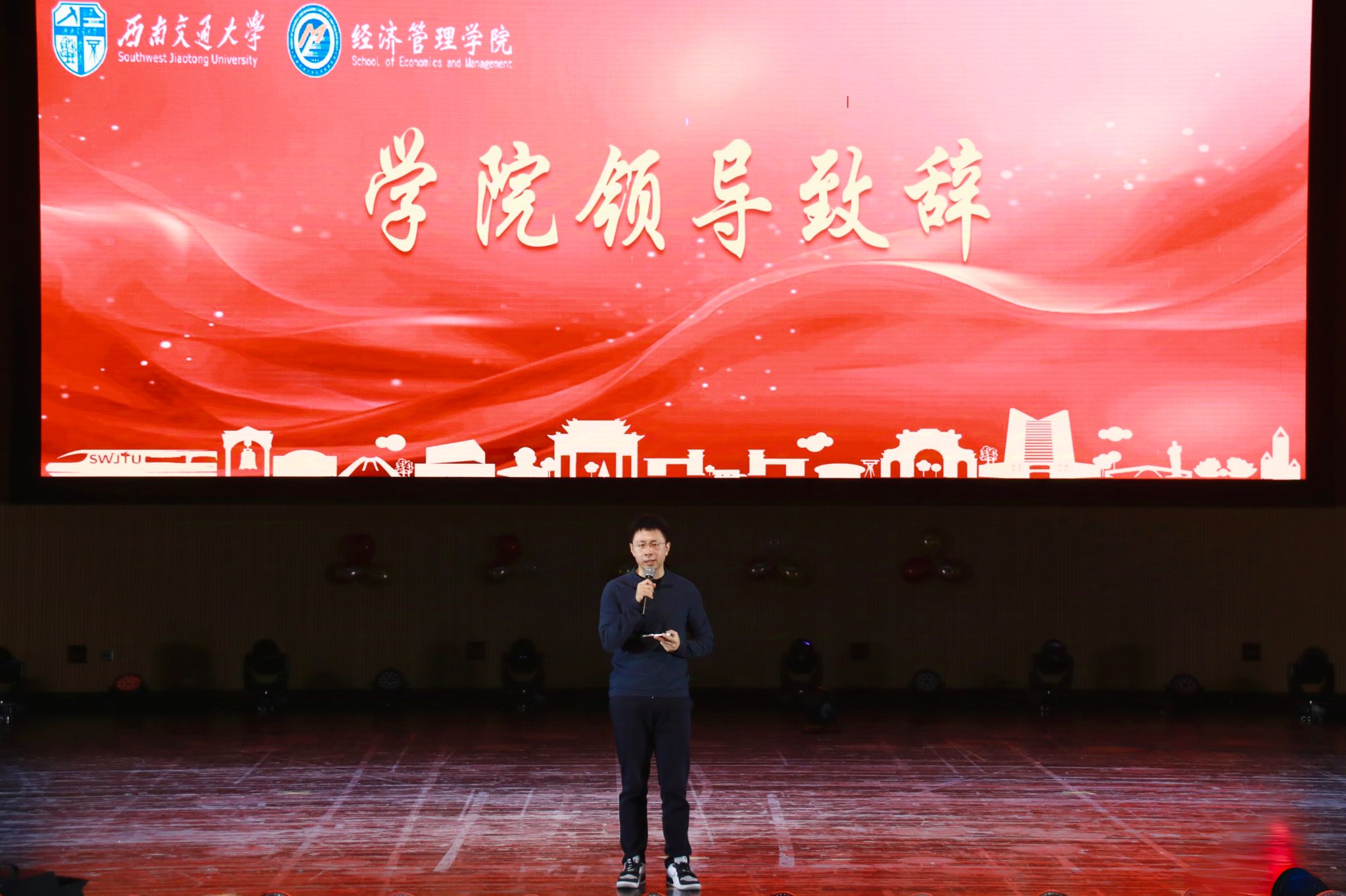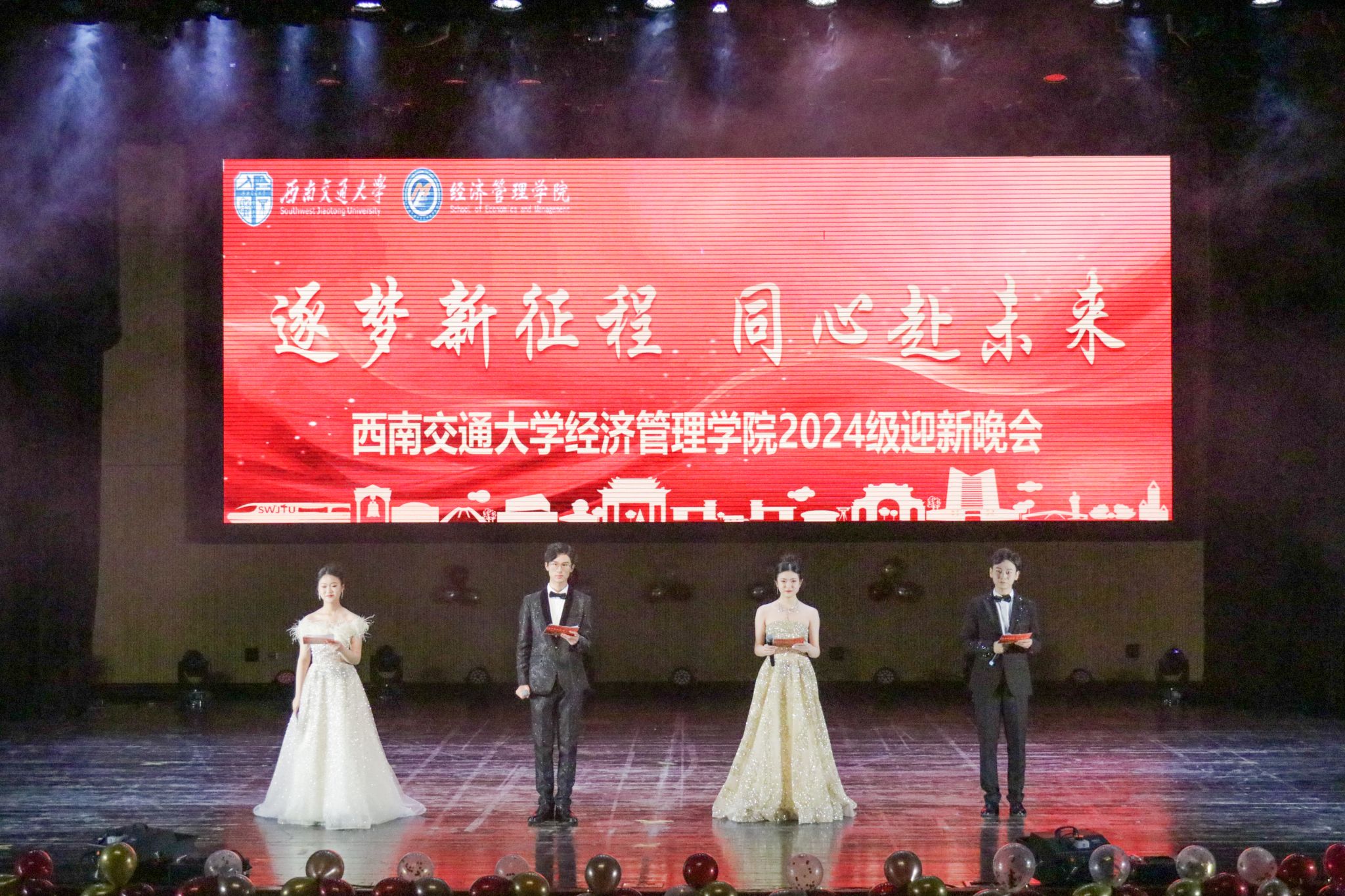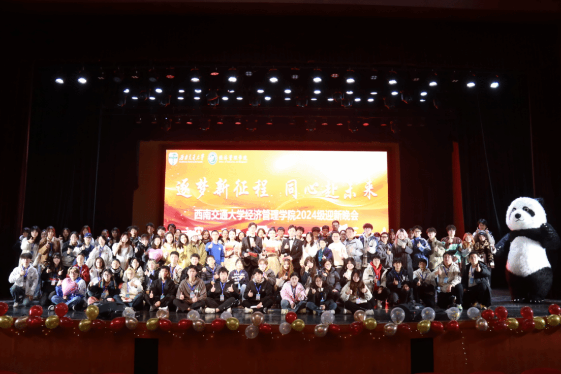 为热烈欢迎2024级经管新学子,迎接2025年的到来,2024年11月30日,402永利集团官网入口在九里校区大学生会堂举办“逐梦新征程 同心赴未来”2024级迎新晚会。402永利集团官网入口院长韩科,党委副书记余小英,副院长李良、聂佳佳,团委书记贾佳,本科2024级各班班主任老师,学生工作组全体辅导员,电子科技大学经济与管理学院、西南财经大学会计学院学生会主席以及各兄弟学院学生会嘉宾出席晚会。