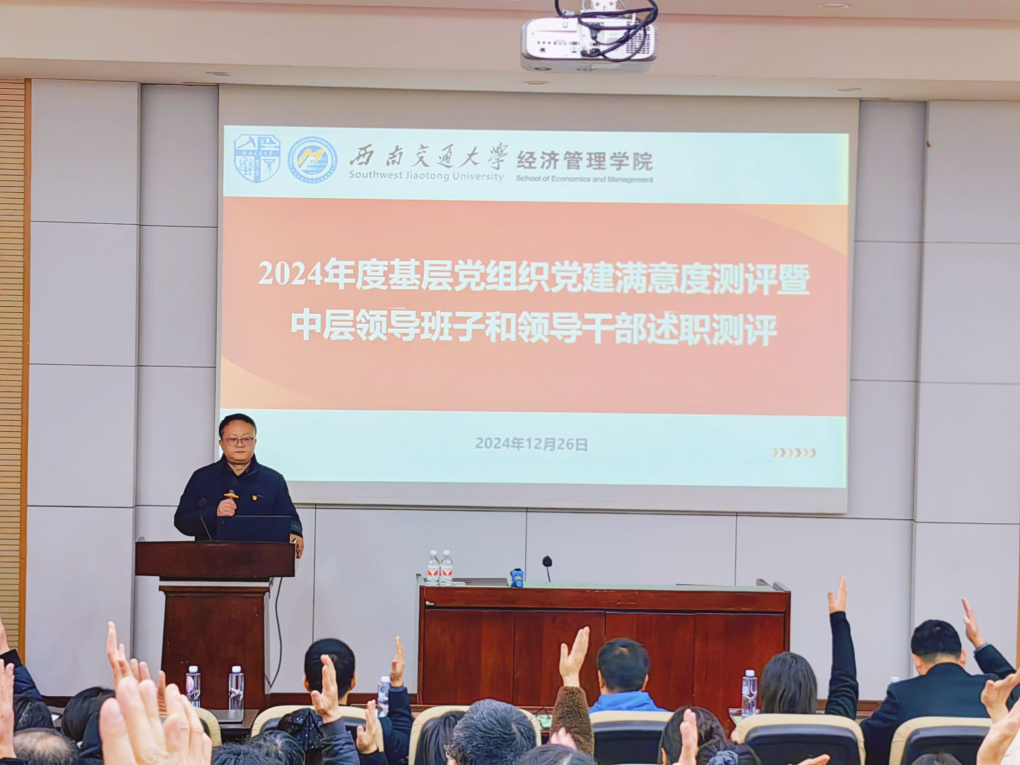 2024年12月26日下午在0215报告厅,按照学校工作部署,402永利集团官网入口召开2024年度党建满意度测评和中层领导干部考评暨2024年双代会。学院党政领导班子全体成员、学院教职工和学生党员代表参加测评,会议由学院党委书记郭强主持。