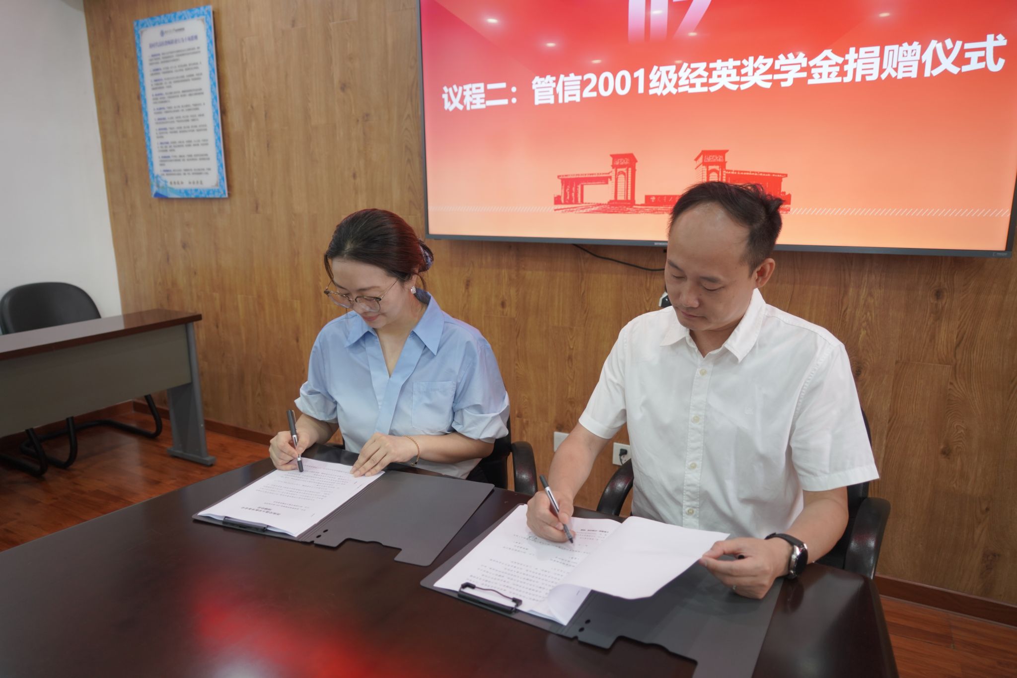 会议第二项议程,学院党委书记蒋佳与01级管信校友代表刘坤签订捐赠协议书,给校友代表发放捐赠证书。