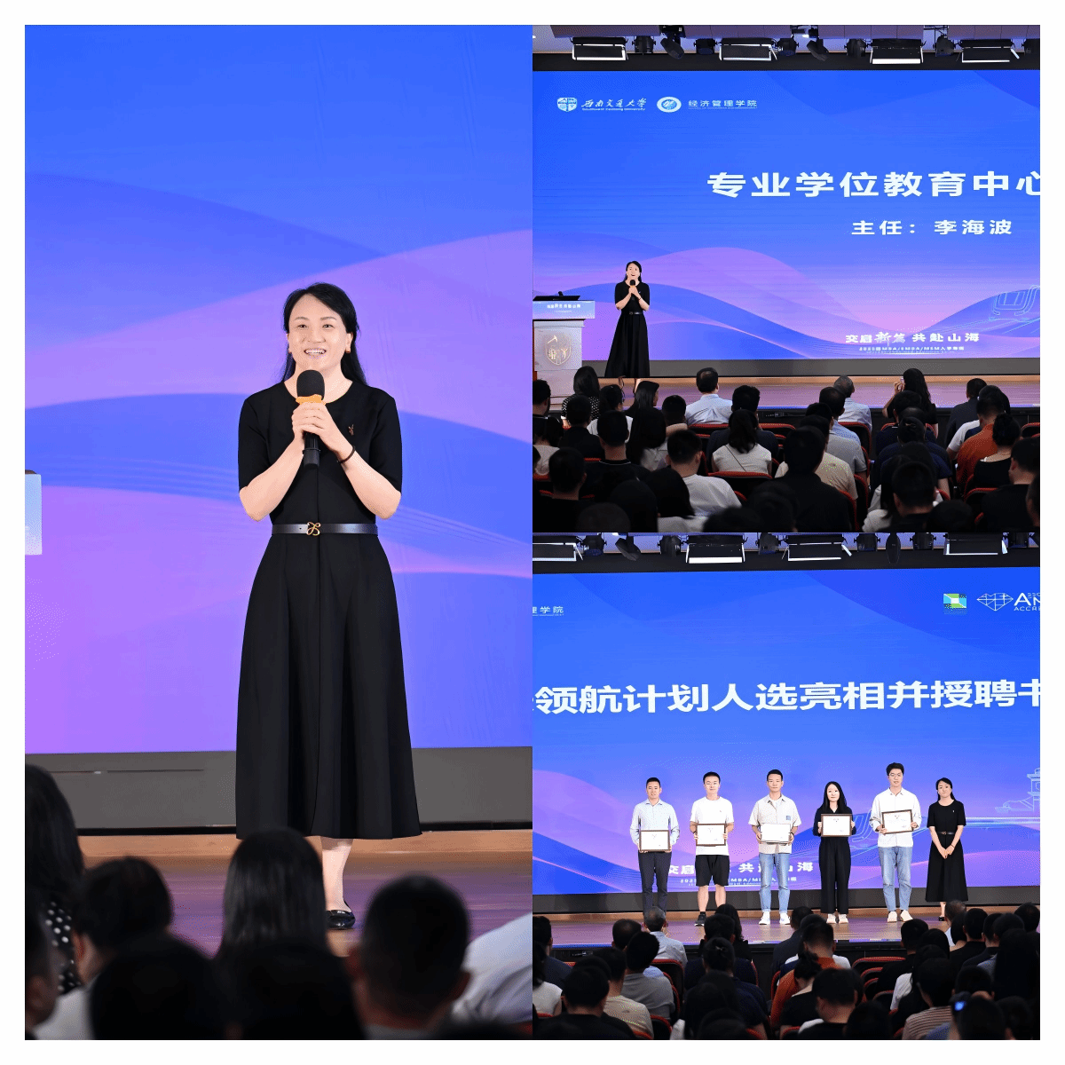 专业学位教育中心李海波主任介绍了中心的基本情况,并携2025级MBA/EMBA/MEM班主任马广平、姚霁芸亮相,同时为“学长领航计划”人选颁发聘书,力图打造“传帮带”成长共同体。这一举措将为新生们提供宝贵的经验分享和指导,助力他们在学习和生活中快速成长。
