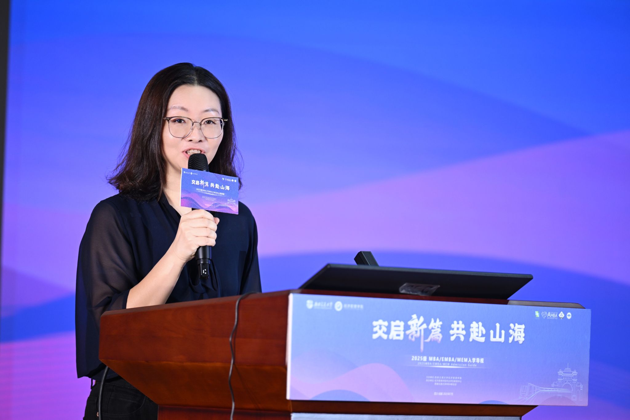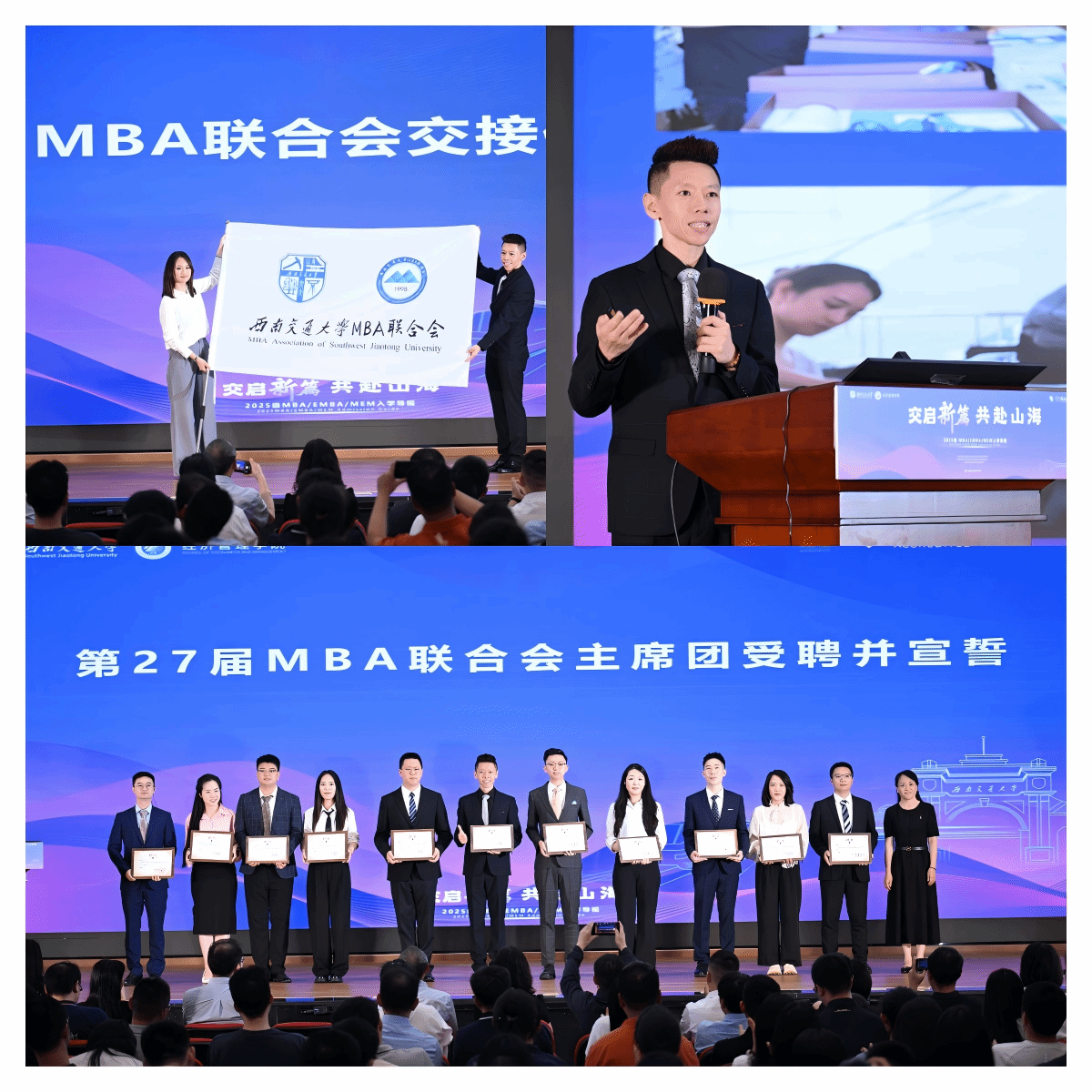 第26届MBA联合会主席陈文莉向第27届MBA联合会主席贾磊移交会旗,象征使命传承,新任MBA联合会主席团宣誓就职。贾磊介绍MBA联合会组织架构与各类活动,围绕“连接-创新-服务”阐述年度规划,期待与25级新生一起携手破雾寻光,越山向海,共创未来。