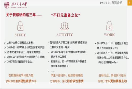 5月10日14点,创新创业中心就业实践部组织的大学生职业生涯规划经验交流会在线上如期举行。古语有言:“凡事预则立,不预则废”,现在我们也总说“机会是留给有准备的人的”。因此本次大学生职业生涯规划经验交流会特邀请了三位在学业与实干方面都颇有造诣的学长学姐针对职业生涯规划的方方面面进行了指导与经验的分享。
