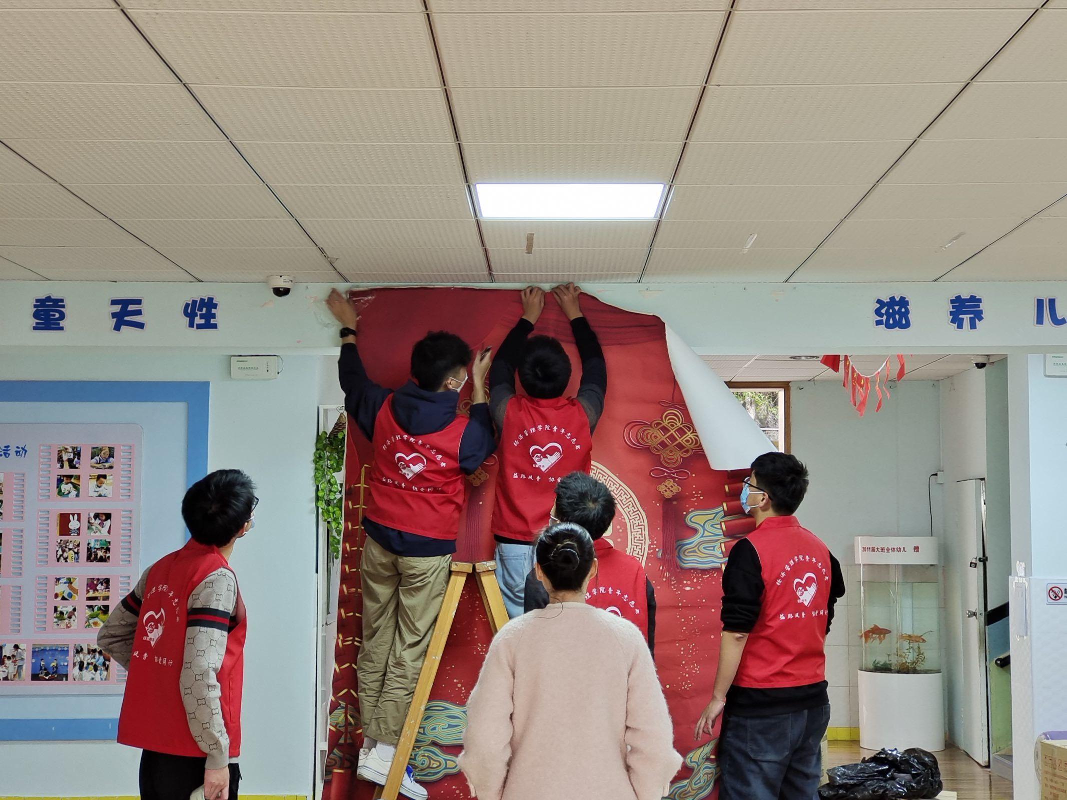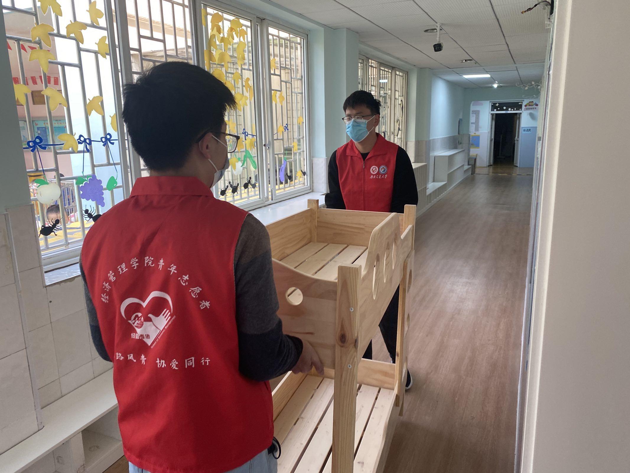 男同学主要负责搬床、桌子、粘贴横幅等。男生们两人一组,还合作搬床位和桌子,解决了幼儿园女老师们不好搬运床位、桌子等物品的问题。另外,新年将至,志愿者们用美好的新年祝福语装饰墙面,为幼儿园增添了一份喜庆热闹的新年色彩。