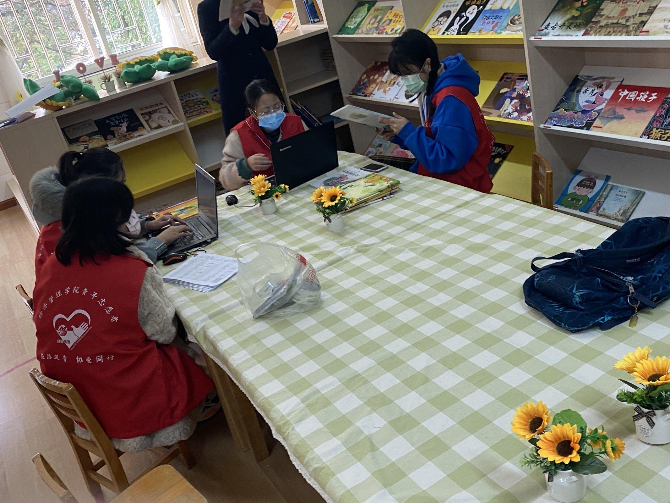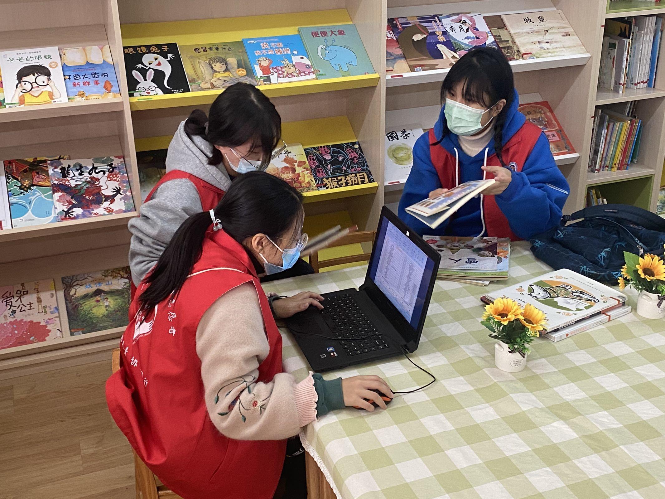 女同学负责将幼儿园书籍归类整理,帮助交大幼儿园的小朋友们,为他们创造了方便舒适的阅读环境。