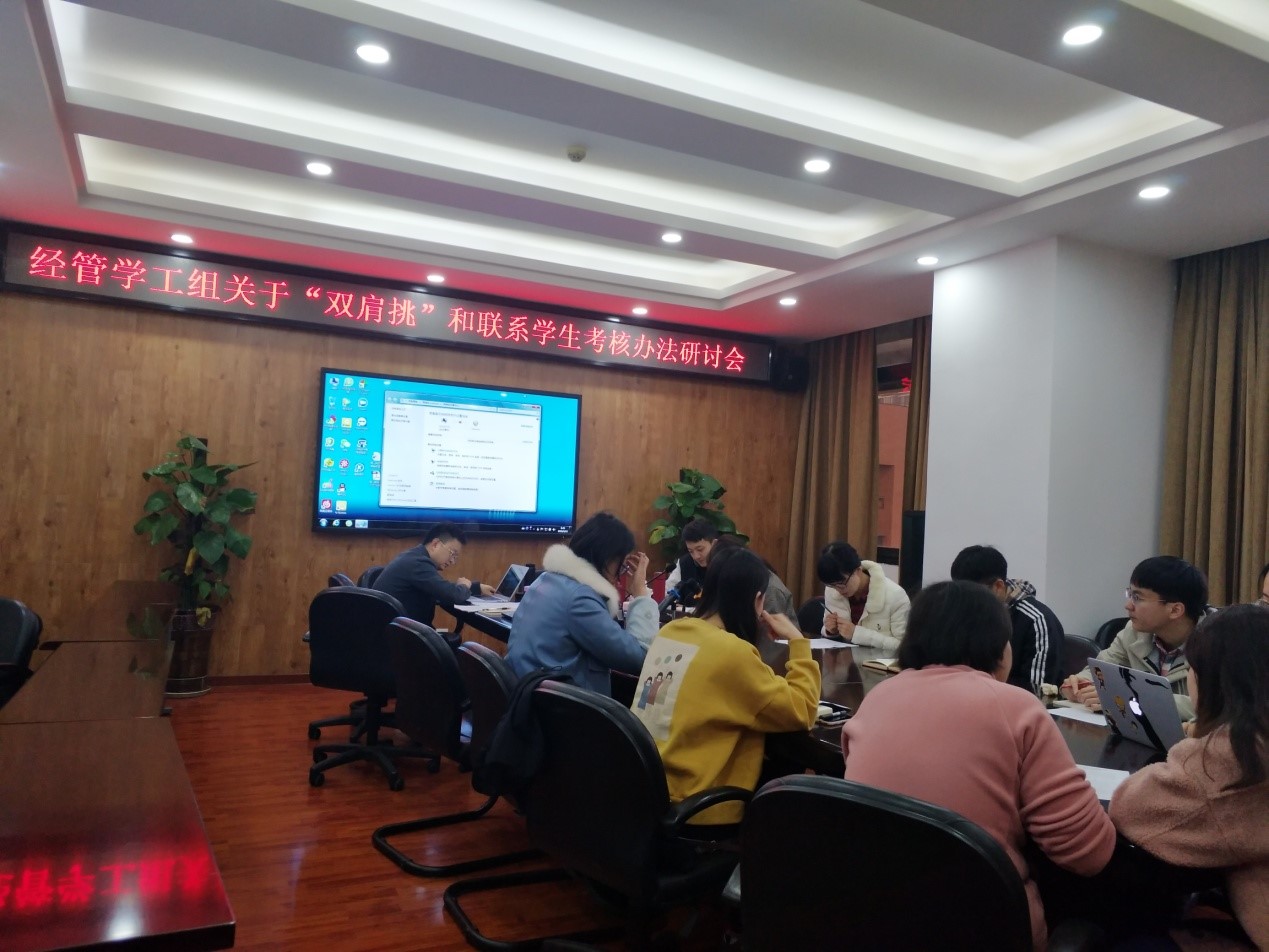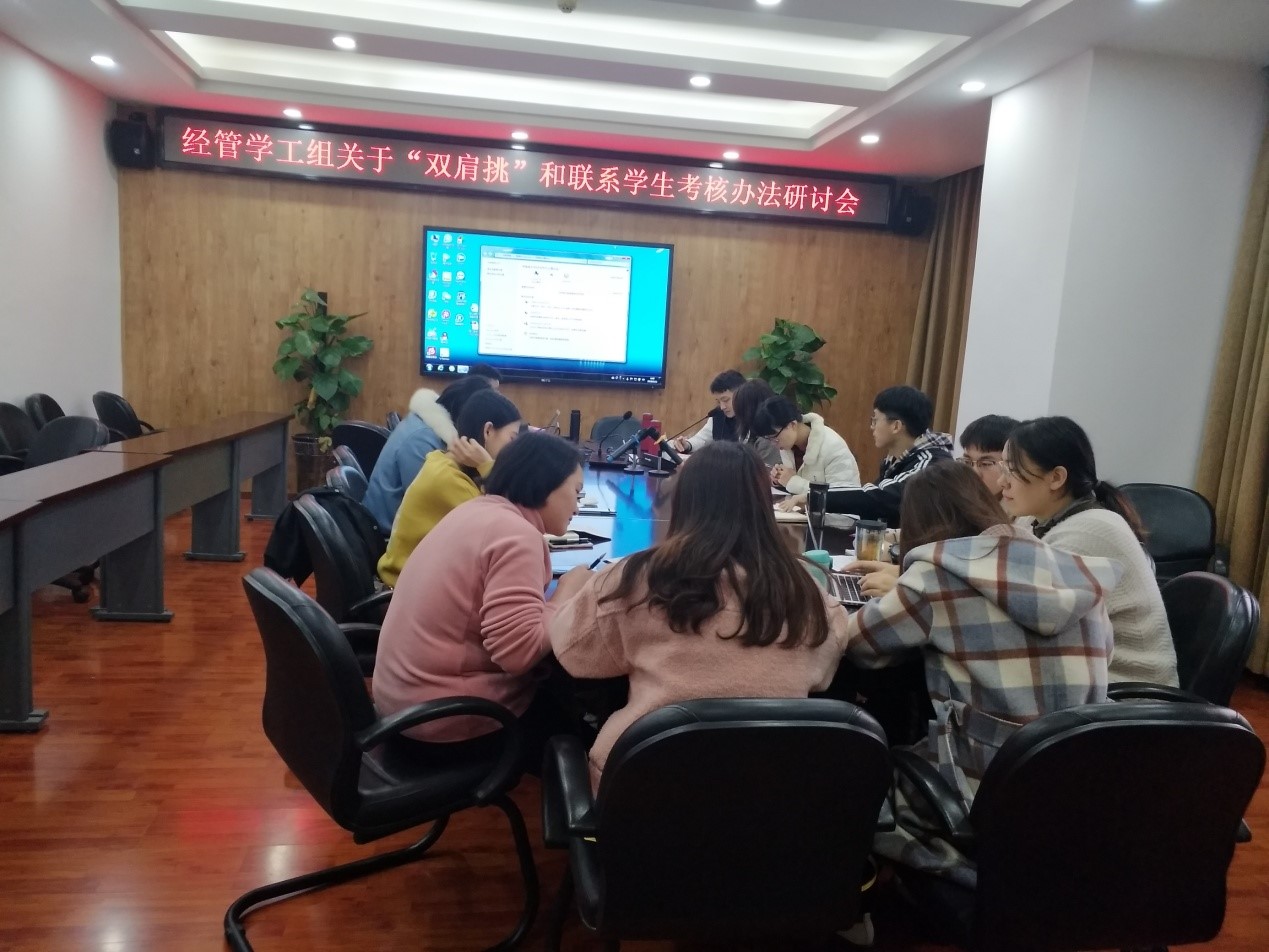 首先在贾佳老师的主持下,大家对《中共402永利集团官网入口委员会关于进一步加强辅导员深入学生联系学生工作管理考核办法》和《402永利集团官网入口专职辅导员“双肩挑”资格认定及薪酬管理办法》进行了认真地学习讨论,各位辅导员根据自身实际情况对《办法》提出修改意见。接下来,贾老师和大家讨论了关于经管学院学生组织举办各类活动时所出现的问题,以及解决办法。