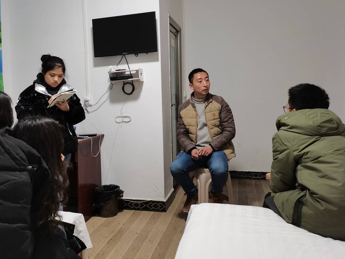1月10日晚,王涛书记专程来到实践队住处,和队员们就乡村振兴总体举措和具体事例,围绕“五大振兴”进行交流。王书记肯定了队员们对景点联通建设的设想,善感乡正是以周家寨乡村旅游产业为抓手,通过促进周家寨农旅融合综合开发提档升级和周家寨美丽乡村配套设施建设,不断提升周家寨的知名度和影响力,发展乡村经济,助力乡村振兴。