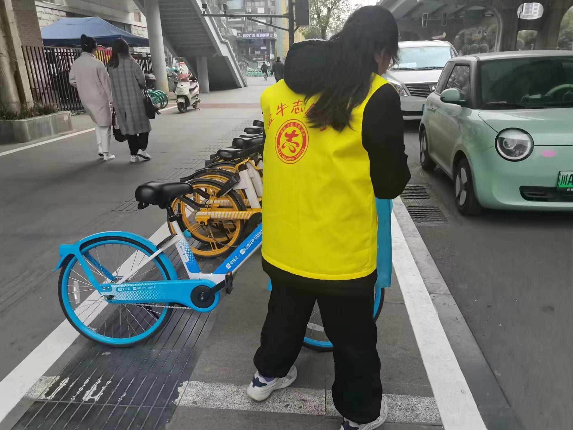 志愿者规范摆放路边自行车