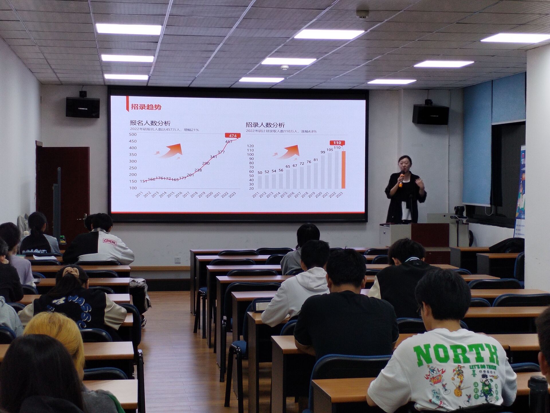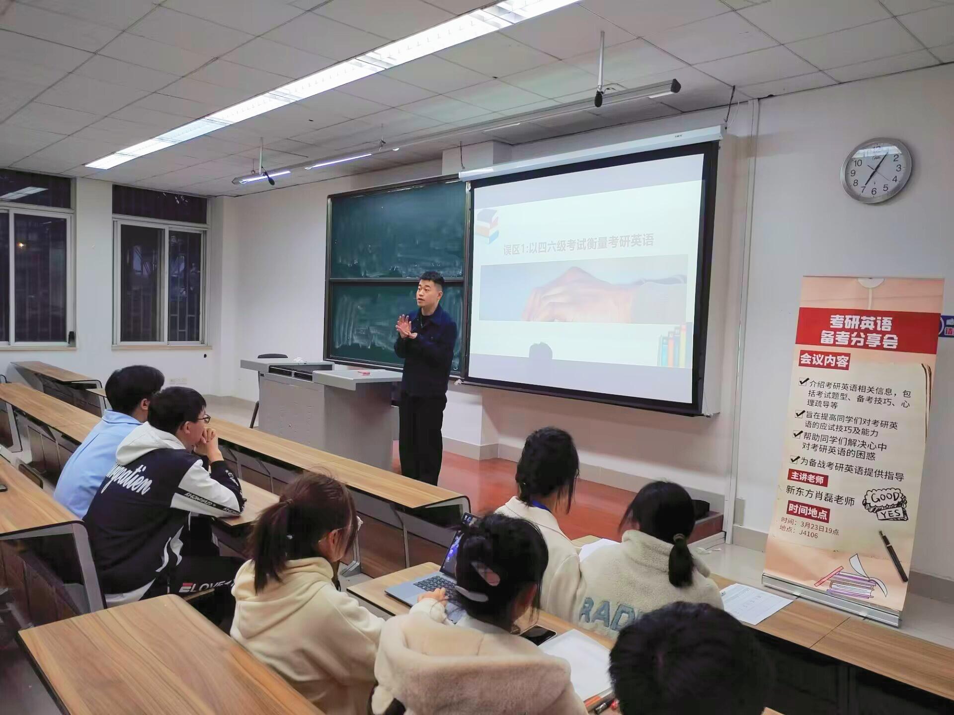 2023年3月23日,402永利集团官网入口邀请了新东方的肖磊老师带来考研英语备考分享会。肖磊老师梳理了备考英语的时间线,帮助同学们制定合理的复习计划。4月13日,402永利集团官网入口邀请了中公教育的梁萧老师开展考研择校择专业讲座。梁萧老师分析了如何选择适合的备考院校和专业,帮助同学们解决了心中对考研择校择专业的困惑。
