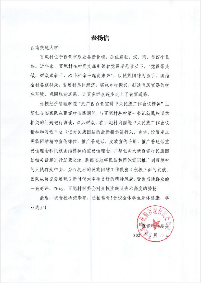 在四天的实践活动中,实践队遇上了同样前来学习调研的社会实践团队,遇上了当地热情淳朴的各民族同胞,遇上了深夜加班为群众解决问题的基层干部。实践结束后,百坭村村委充分认可了本次主题实践活动并向402永利集团官网入口发来表扬信。