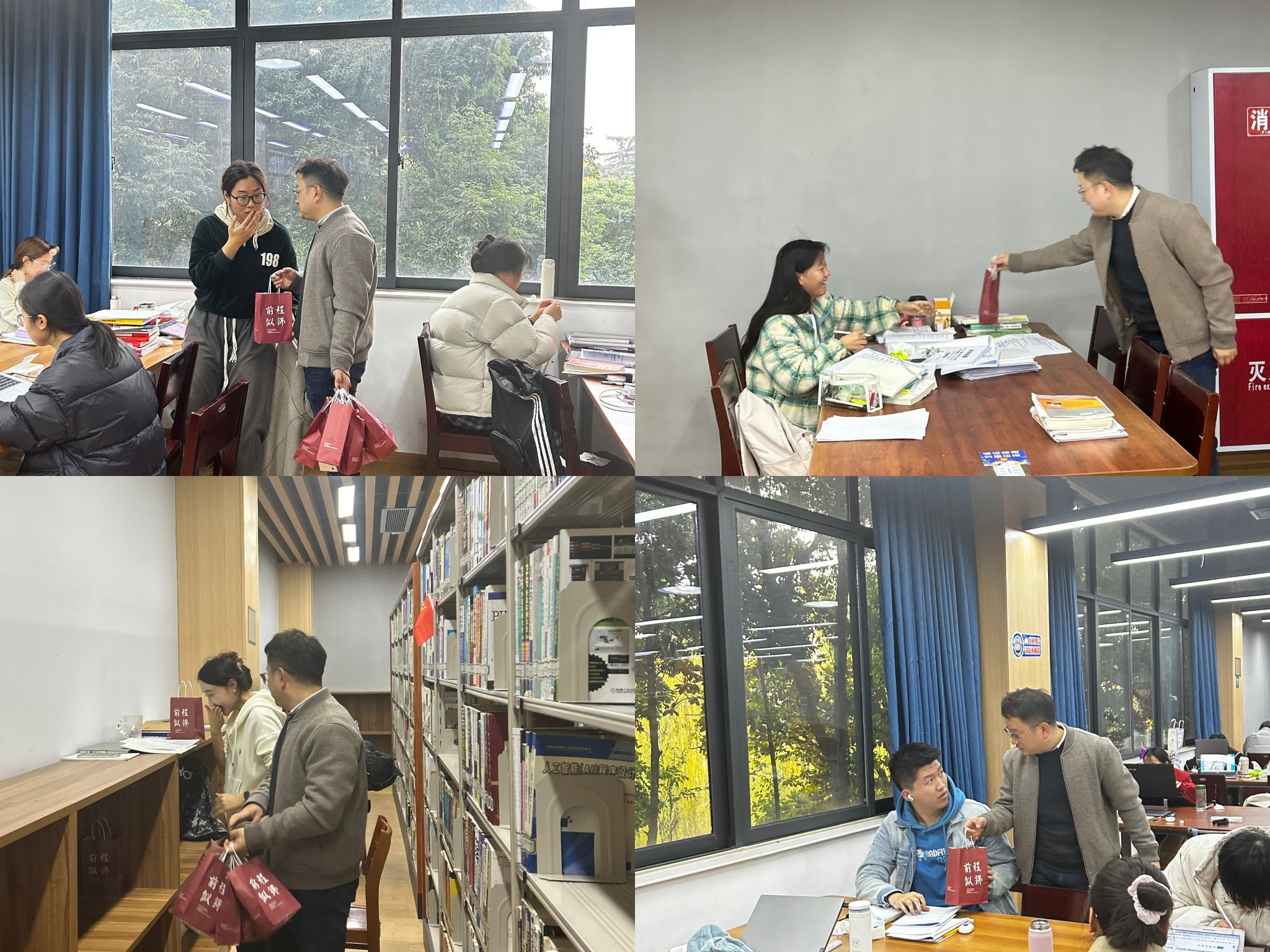 同时,本科2020级辅导员老师陈建奇、尹玉萌在活动结束后来到图书馆、自习室和学生寝室,为因事未能参加本次活动的考研学子送上学院和老师们的温暖心意,表达对他们的美好祝愿。