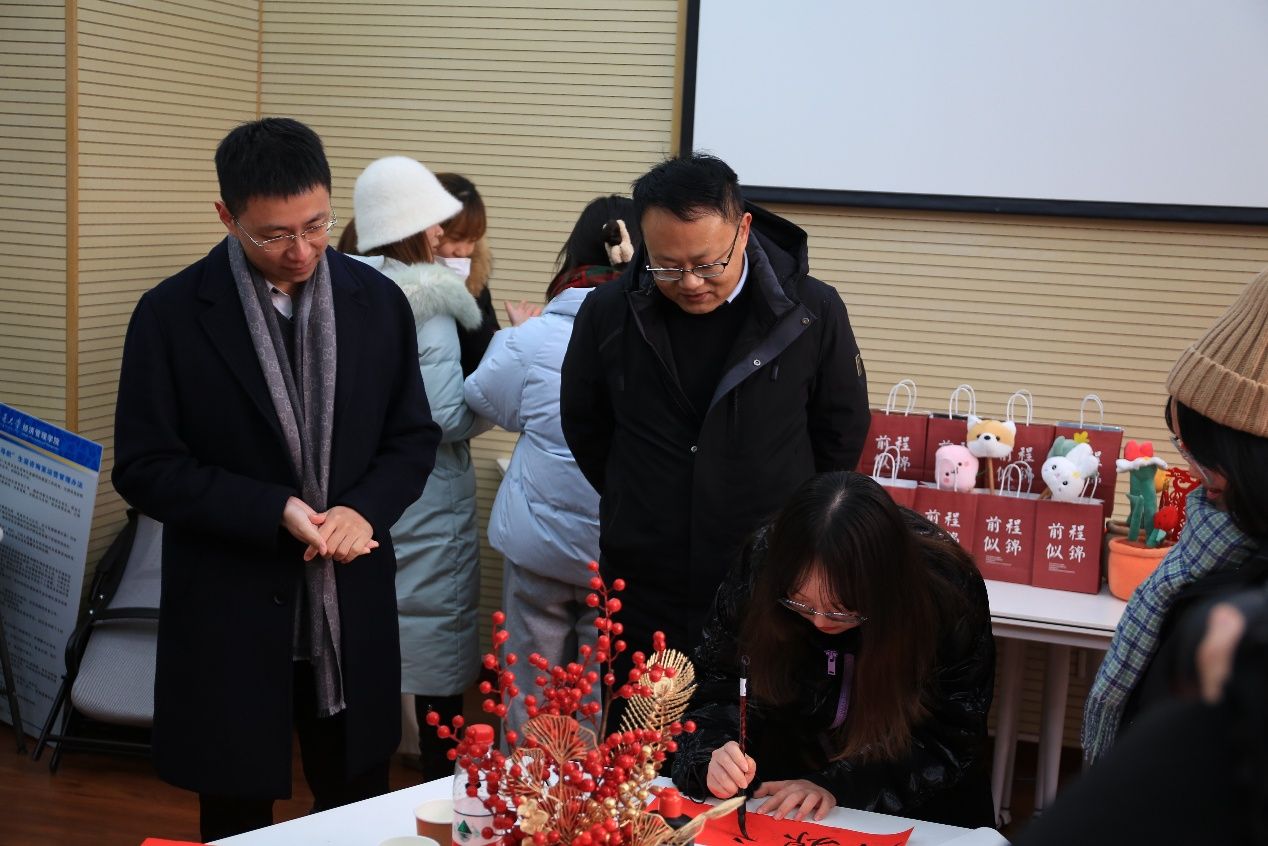妙笔生花颂祥瑞,翰墨留香迎新春。老师和同学们随后来到学院“寒假留校学生之家”,一同写福字、抽取新春盲盒。桌子前老师和学生们展纸援笔、挥毫泼墨,一笔一划之间,一幅幅寓意喜庆的春联、一个个饱含神韵的“福”字跃然纸上。