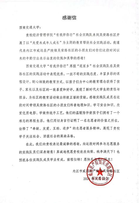 2024年1月15至17日,402永利集团官网入口“有我伴你行”实践队以“扶智又扶志,青春新献礼”关爱未成年人教育帮扶为主题,走进四川省内江市威远县严陵镇,联合新时代文明实践所开展丰富多彩的主题实践活动。实践队员们为孩子们带来了丰富有趣的课程:地理小课堂、“心灵奇旅”电影欣赏课、“平安守护”安全科普课、“布艺工坊”织布手工课等,在拓展知识面的基础上,引导孩子们将所学所感与实际生活相结合。实践队还设计了关于传统文化的创新课程:“欢乐绘春节”绘画课,在培养同学们艺术爱好的同时,也扩展了他们的传统文化知识视野,培养了他们的民族认同感。在“剪影行云”剪纸课中,实践队员带着孩子们认识剪纸的主要形式和意义,在感受新春佳节氛围的同时,也不断学习中华民族传统文化。活动结束后,实践团队收到了来自吴荣路社区的感谢信。