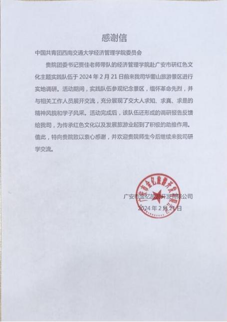 2024年2月20日,402永利集团官网入口实践队在团委书记贾佳、副书记苏扬老师的带领下,前往四川省广安市开展寒假“返家乡”社会实践活动。实践队首先来到邓小平故里参观调研,感受邓小平同志的伟大人格和崇高精神。参观结束后,实践队成员们分发问卷,与游客亲切交流,收集他们的意见和建议,共同探寻红色文化的深厚底蕴。第二天,实践队继续深入广安,探访了华蓥山。在结束实地参观后,实践队与广安市金亿旅游开发有限公司总经理曾辉开展了研讨座谈会并分享了队伍对广安红色旅游发展的看法。实践活动结束后,团队收到了来自广安市金亿旅游开发有限公司的感谢信。