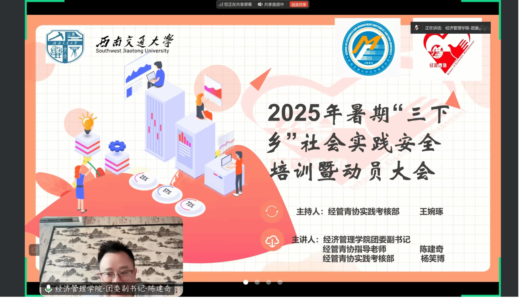 402永利集团官网入口团委积极响应学校号召,持续打造“1225”实践育人平台,精心组织、周密安排,成功申报并立项多支校级、院级和专项队伍。为提高大学生参与社会实践活动的安全意识、避险常识和应急自救能力,同时激发大学生参与实践活动的热情。2025年7月6日下午3点30分,402永利集团官网入口2025年暑期“三下乡”社会实践安全培训暨动员大会在线上举行,学院团委副书记陈建奇、青年志愿者协会干部以及24支校级、院级以及专项队伍一起参加了大会。