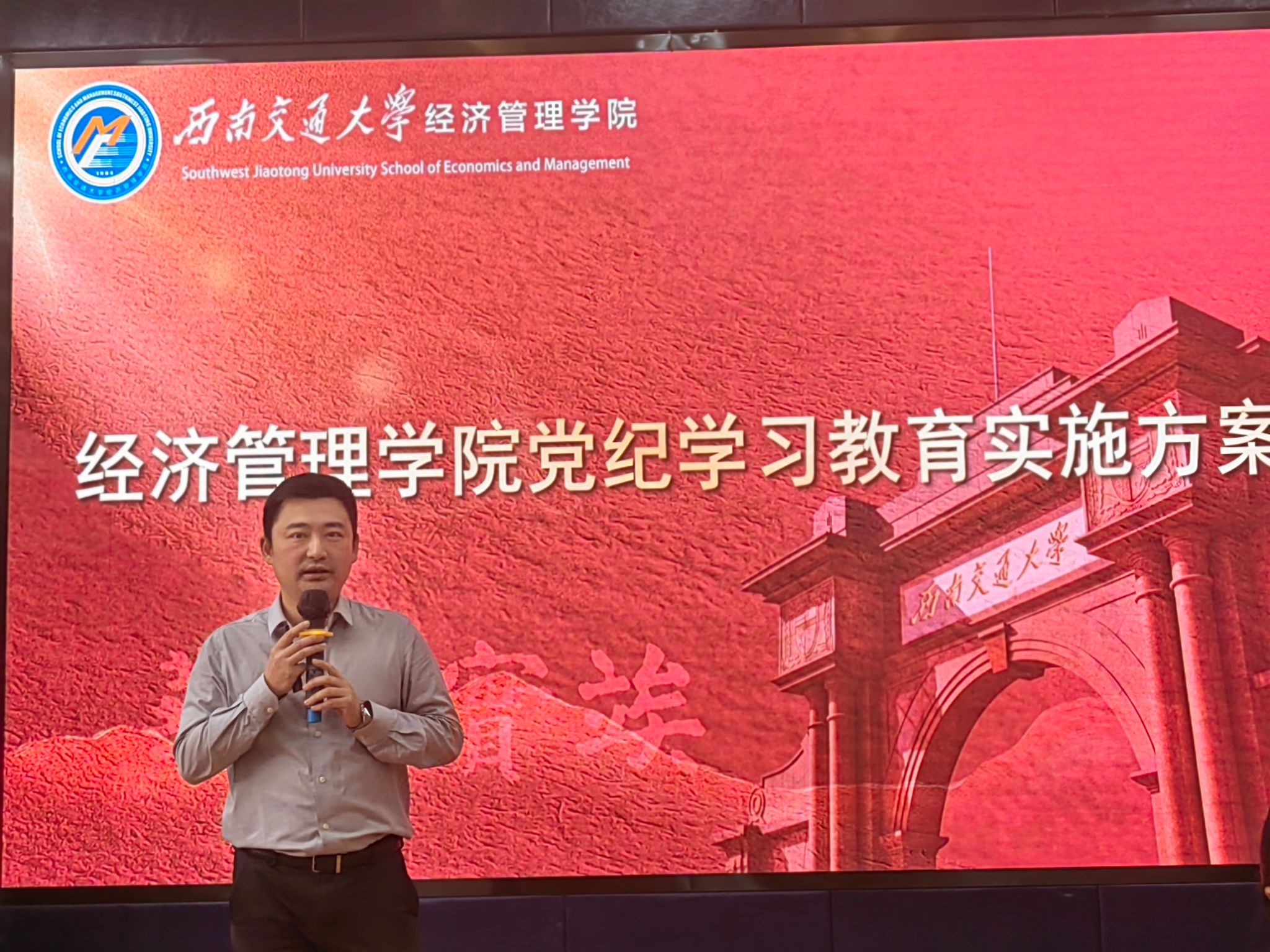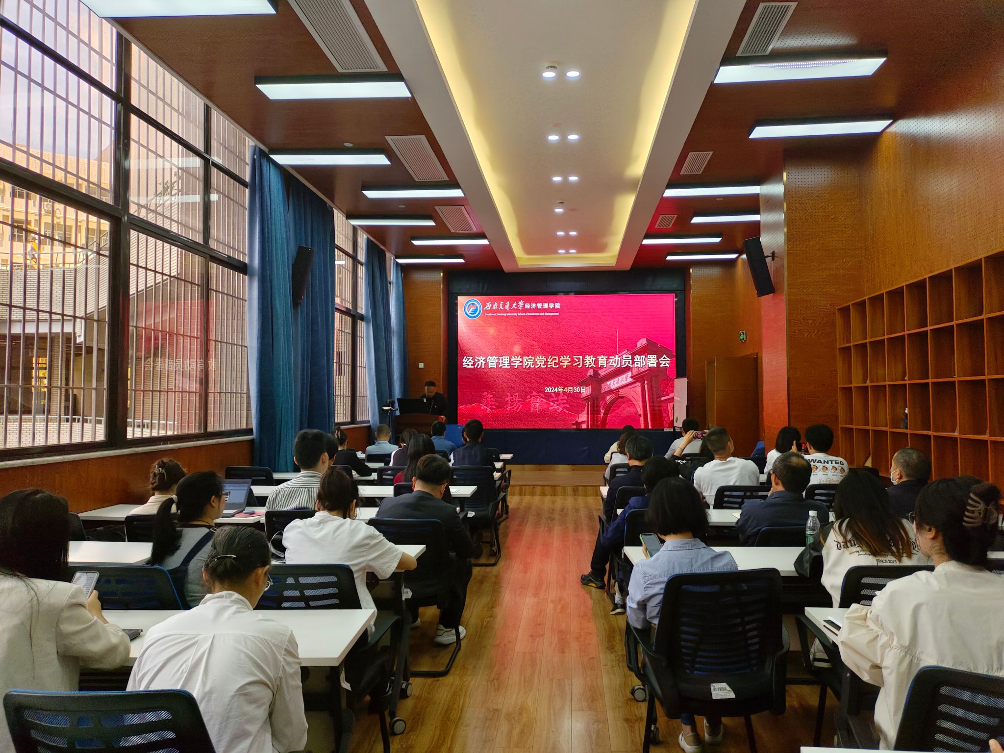 4月30日下午2:30在九里校区零号楼0218教室,402永利集团官网入口党委召开党纪学习教育动员部署会。学院党委书记郭强同志主持会议,党委副书记、纪委书记晏理斌同志作学习教育动员,学院领导班子成员、党委委员、师生各党支部书记和委员参加会议。