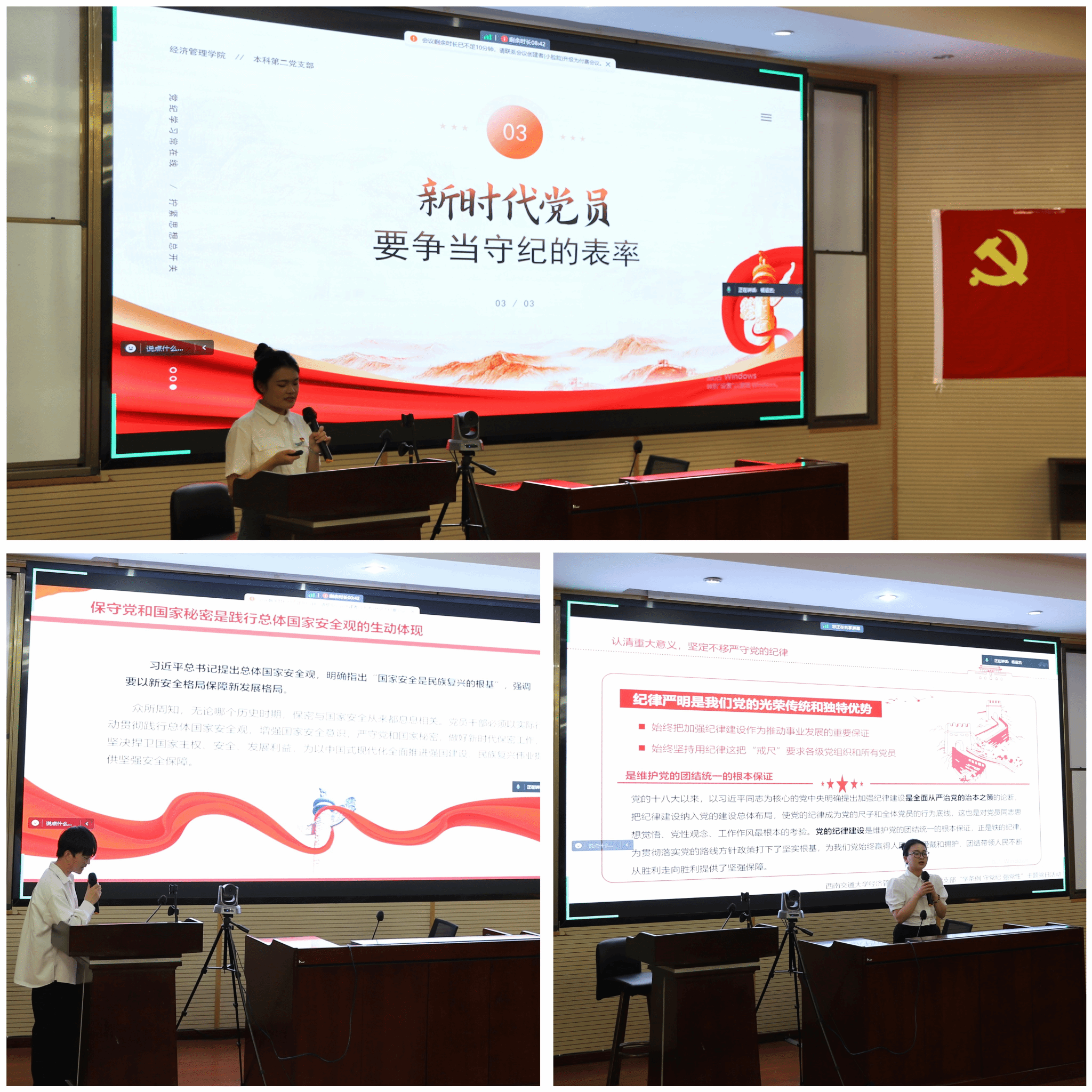 活动伊始,党支部书记陈建奇为嘉宾张震宇老师介绍了支部的情况,本科第二党支部以党团建设促思政育人实效为宗旨,坚持实施“三联动两融合一阵地”工作机制,充分发挥党支部的战斗堡垒作用,促进党支部工作创新发展。接着,张震宇为本科第二党支部的全体同志带来党纪学习教育专题分享。张老师主要从政治纪律、组织纪律、廉洁纪律、群众纪律、工作纪律、生活纪律六个方面带领同学们原原本本、逐条逐章深入学习《中国共产党纪律处分条例》,并结合实际案例生动地阐述了党纪学习教育的重要性,启示同学们要常敲思想警钟,常存敬畏之心,常紧纪律之弦,结合实践不断加深对党的纪律规矩的学习、理解与认识,筑牢思想及纪律的防线。