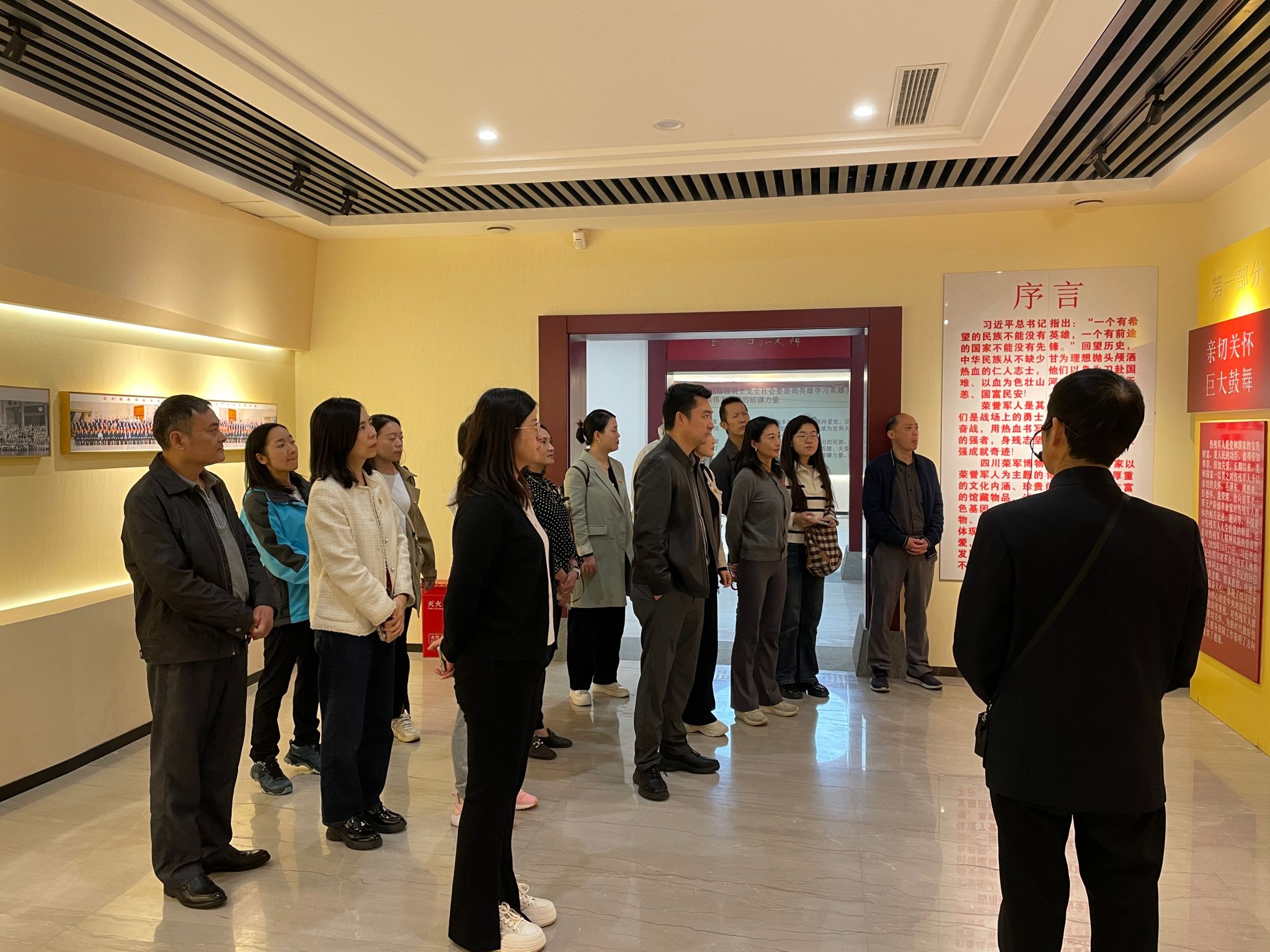 抵达四川荣军博物馆后,大家共同观看了爱国主义教育片《最坚强的人》,在博物馆讲解员的带领下,参观了序言厅、英雄墙以及“峥嵘岁月 永恒初心”等展厅,学习了习近平总书记给四川省革命伤残军人休养院全体同志回信全文。通过博物馆内珍藏的革命伤残军人的实物展品、珍贵图片和文献资料,深刻感受到革命先烈坚定的革命信念、顽强的革命意志和伟大的革命精神,认识到革命胜利和幸福生活来之不易。