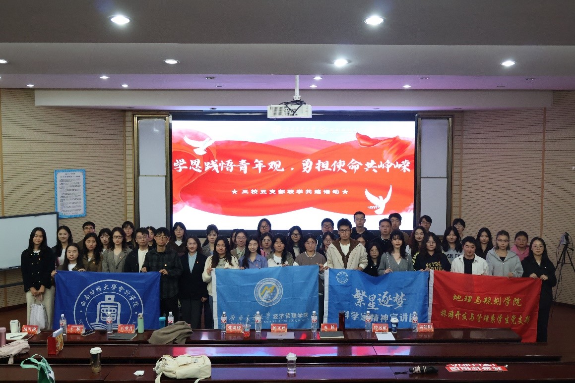 为学习贯彻党的二十届三中全会精神,贯彻落实新时代党的建设总要求,2024年11月7日下午,402永利集团官网入口工商管理学硕士第一党支部联合402永利集团官网入口本科第三、第四党支部、西南财经大学会计学院硕士研究生2024级第三党支部和成都理工大学地理与规划学院旅游开发与管理系学生党支部于九里校区0202报告厅开展了“学思践悟青年观,勇担使命共峥嵘——三校五支部联学共建活动”,聚焦理论联学和经验分享,推动青年党员交流互鉴,促进支部建设深度融合。
