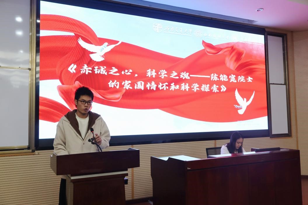 活动第一环节为理论联学,来自三所学校的支部结合学校或专业特色进行了专题分享。402永利集团官网入口“繁星逐梦”科学家精神宣讲团讲师高朝阳首先带来了《赤诚之心,科学之魂——陈能宽院士的家国情怀和科学探索》的专题宣讲,展现了陈能宽院士的家国情怀与科学探索精神,激励在场的各位同志学习红色精神,坚定理想信念,以报国为己任,将科学研究融入国家发展过程当中。