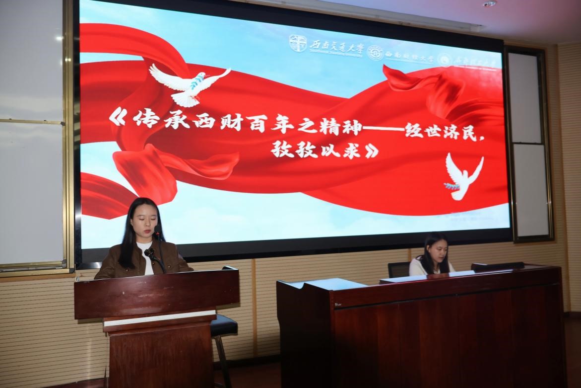 接下来,西南财经大学会计学院硕士研究生2024级第三党支部书记王娇以西财百年精神“经世济民,孜孜以求”为主线,向大家介绍了西南财经大学的基本情况,展现了学校师生胸怀国计民生、刻苦钻研、探索真理、勇于实践、艰苦创业的理想追求。