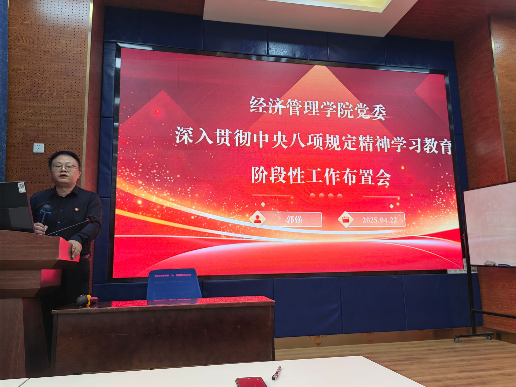 2025年4月22日,学院党委在0218教室召开深入贯彻中央八项规定精神学习教育阶段性工作布置会,学院党委书记郭强、副书记余小英、党委组织员以及师生党支部书记30余人参加了会议。