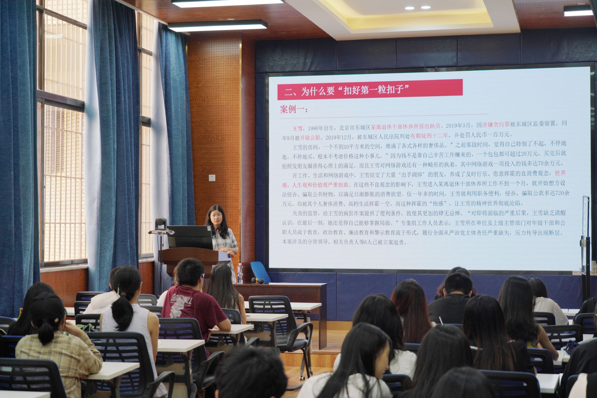 围绕“为什么要扣好第一粒扣子”,余小英结合当前社会发展形势与青年成长特点进行深入剖析。她强调,面对未来职场中可能遇到的复杂环境与诱惑挑战,唯有系紧系牢廉洁自律的“扣子”,方能在大是大非面前保持清醒,在风浪考验中站稳立场,行稳致远。