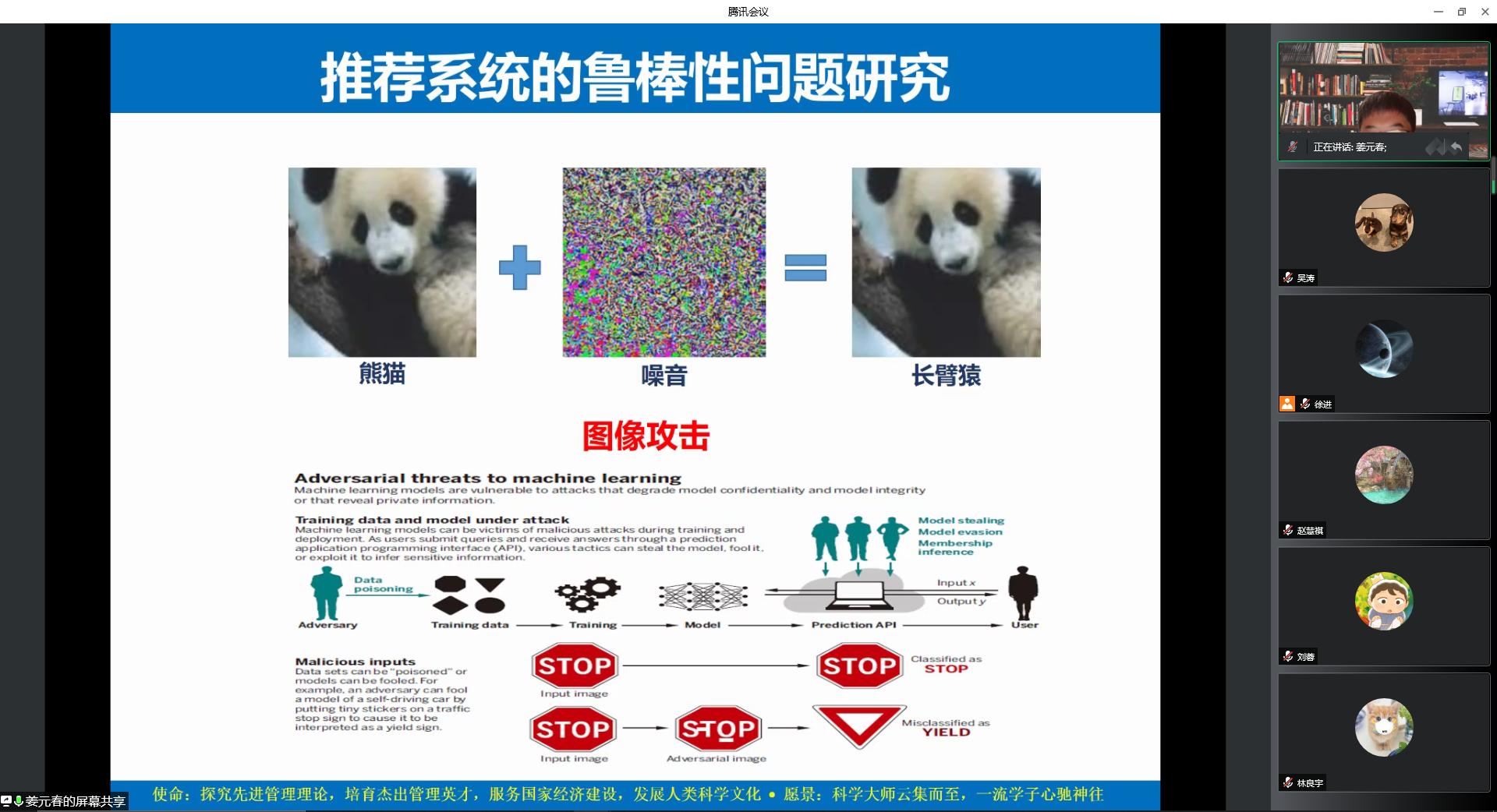 2022年7月8日上午9点30分,合肥工业大学管理学院姜元春教授应邀以“个性化推荐系统及其鲁棒优化问题研究”为题在线上为学院师生带来了一场精彩的学术分享,本次学术活动由学院信息系统与运营管理系徐进副教授主持,学院副院长聂佳佳教授、学院教授委员会副主任李军教授、刘盾教授、实验室执行主任耿维副教授及40多名研究生参加了本次线上学术活动。