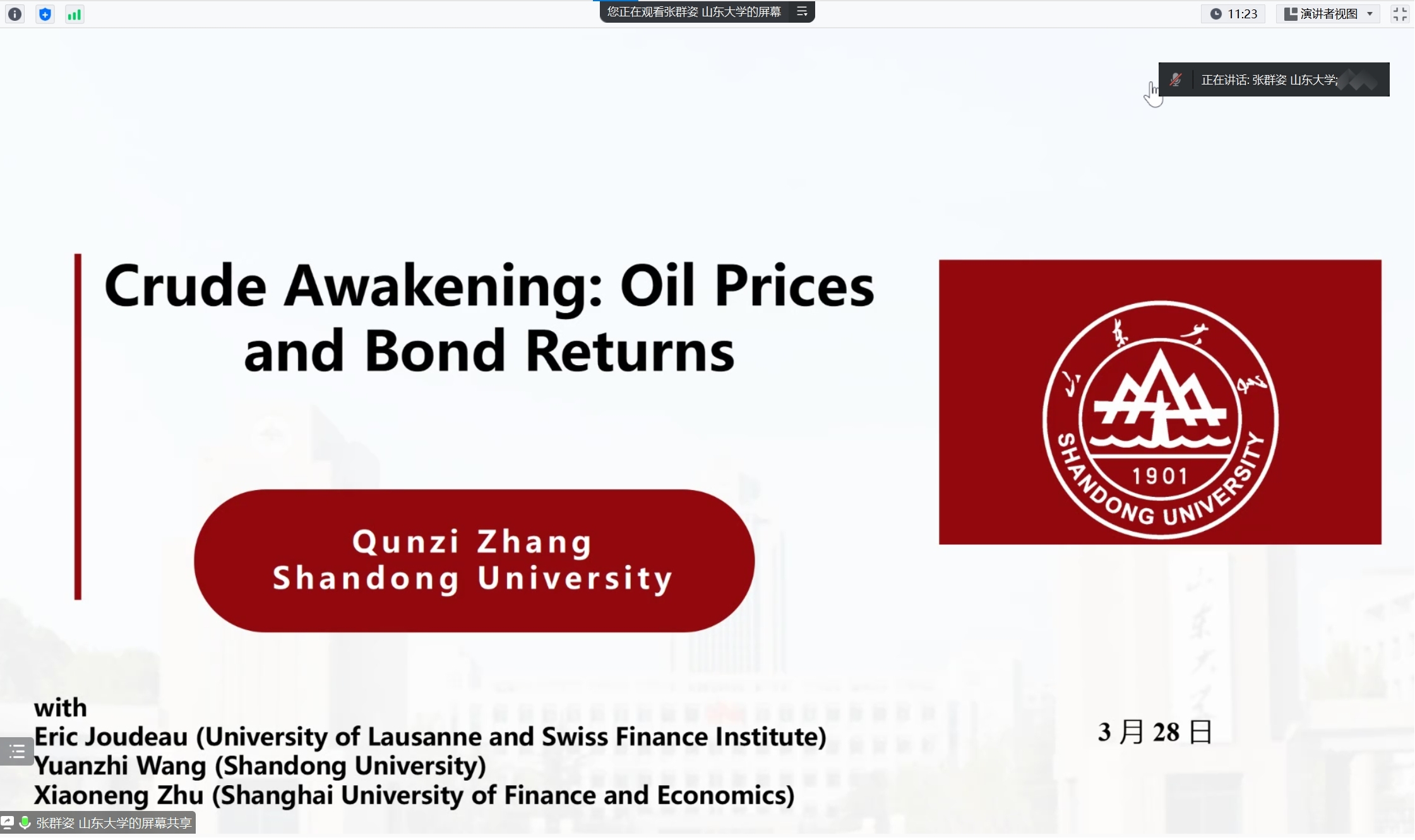 2023年3月29日上午10点,山东大学经济学院金融系张群姿教授为永利集团官网师生分享题为“Crude Awakening: Oil Prices and Bond Returns”的学术报告,讲座由402永利集团官网入口金融与财务学系马锋副教授主持,学院老师和研究生同学积极参与了此次讲座。
