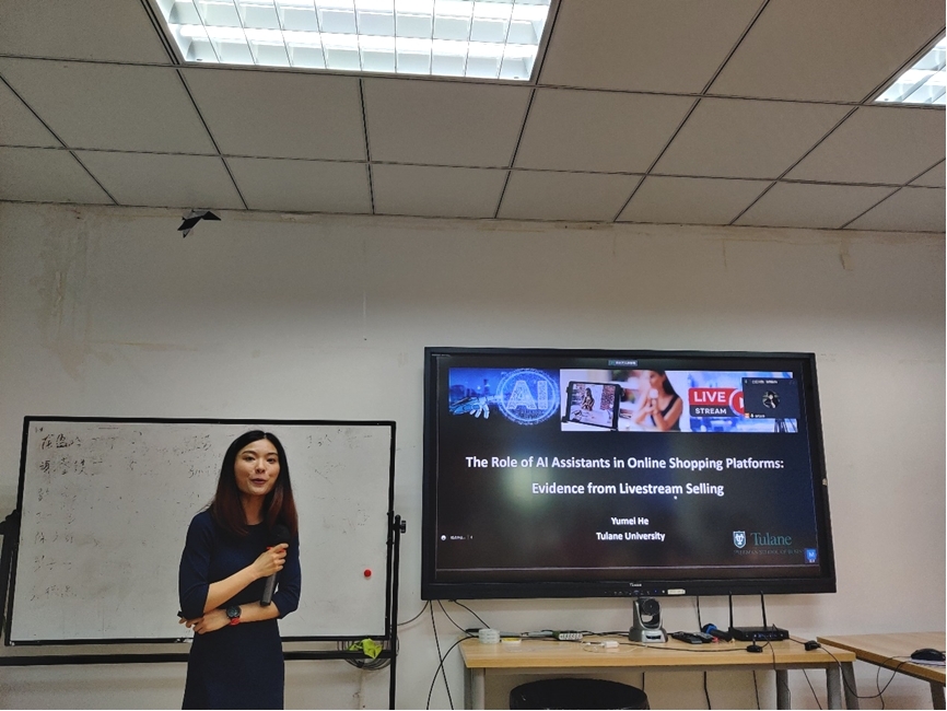 2023年6月16日上午,杜兰大学弗里曼商学院助理教授何玉梅应邀在学院0411室开展题为“The Role of AI Assistants in Livestream Selling: Evidence from a Randomized Field Experiment”的学术讲座。讲座由学院信息系统与运营管理系刘盾教授主持,永利集团官网教师徐进副教授、陈瑾轩老师,电子科技大学经济与管理学院钱宇副教授、四川农业大学商旅学院李良强老师,以及学院40名研究生参与了此次学术活动。